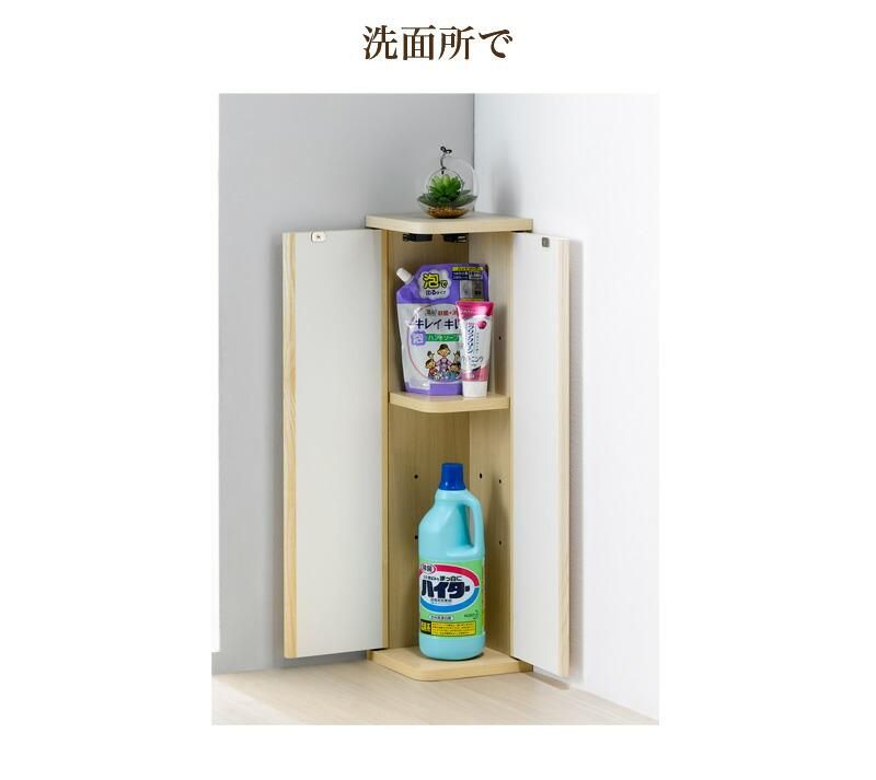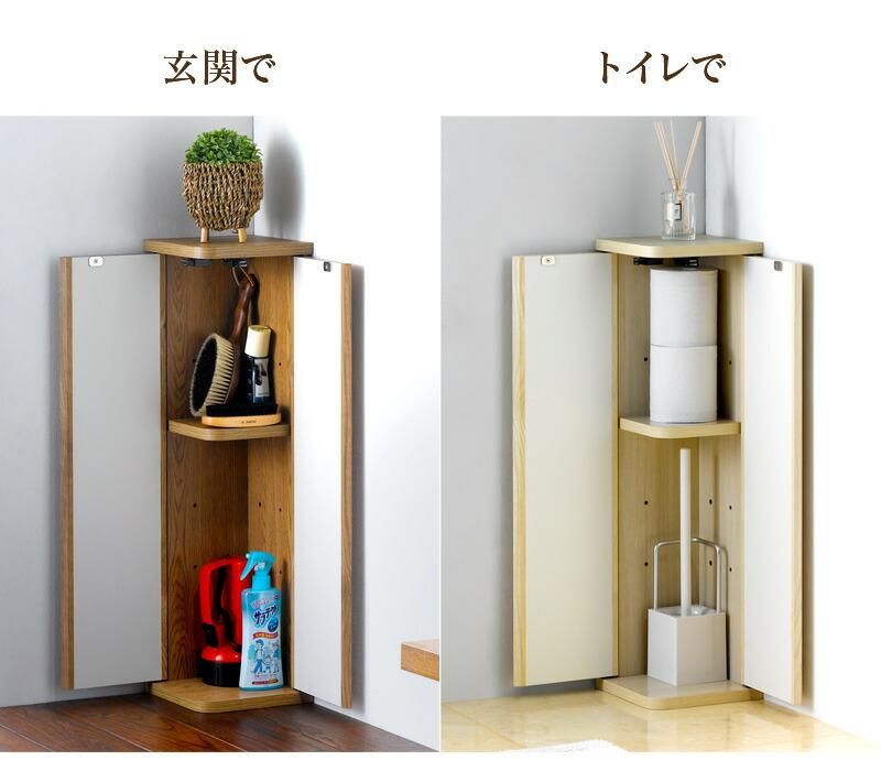 この商品は沖縄・離島は配送不可となります。 配送先が不可地域に該当する場合は誠に申し訳ございませんが、ご注文キャンセル処理させていただきます。 商品説明 トイレやキッチン、玄関など様々な小物を収納。 靴べらや靴のお手入れグッズ入れとしてや、掃除用品の置き場にも丁度いい扉付き収納です。扉をL型に2枚取り付けたことで、お部屋のコーナー他の家具の脇にぴったりです。棚板は可動で4段階調整が出来ます。トイレットペーパーなら最大5個収納可能です。完成品ですぐにお使い頂けます。