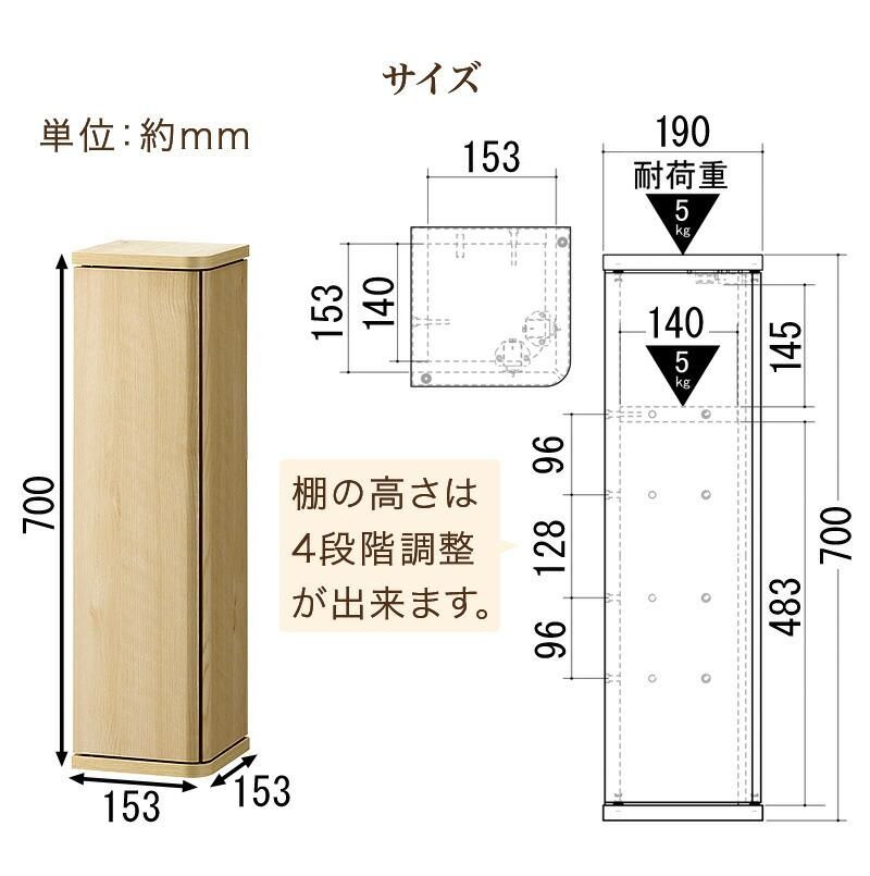 本体サイズ(cm) ■商品サイズ:幅19×奥行19×高さ70cm 商品仕様 主材:プリント紙化粧繊維板、パーチクルボード 耐荷重(kg) 天板耐荷重:5kg、 組み立て 完成品 生産国 マレーシア