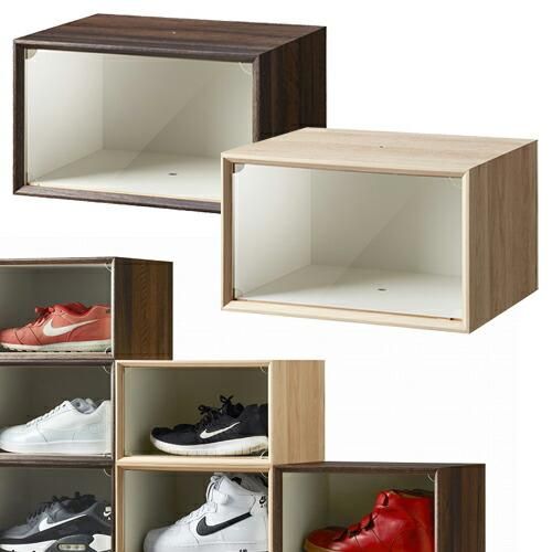 お気に入りのスニーカーやコレクションのディスプレイに。木目仕様で高級感があります。積み重ね可能、前面塩化ビニル製パネルを手で持ち上げて取り外しをする仕様です。中央のジョイント穴で連結させます。カラーはブラウンとナチュラルから選べます。上質感ある木目でモダン、ナチュラル、カントリー調、和風、北欧など様々なテイストのインテリアに合わせやすいです。