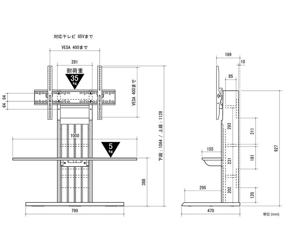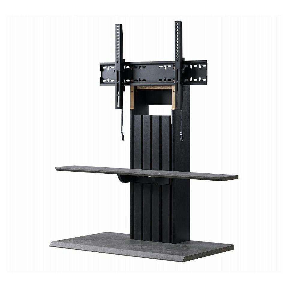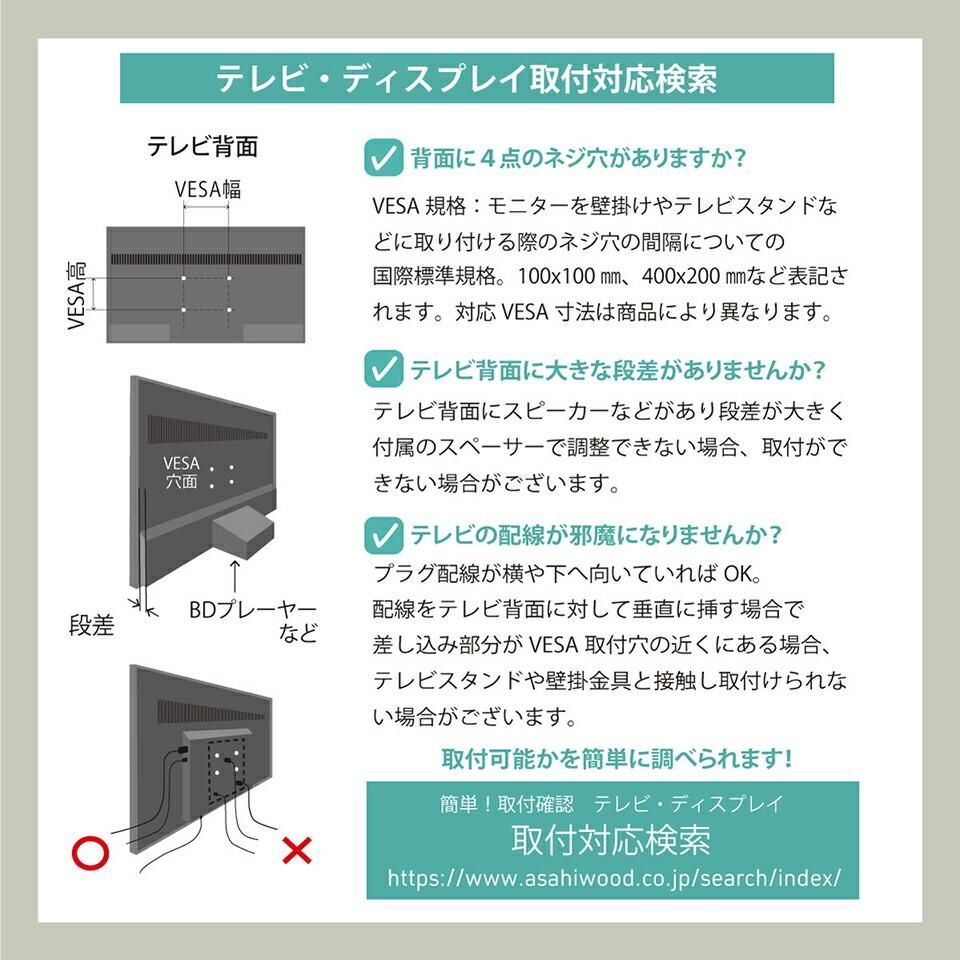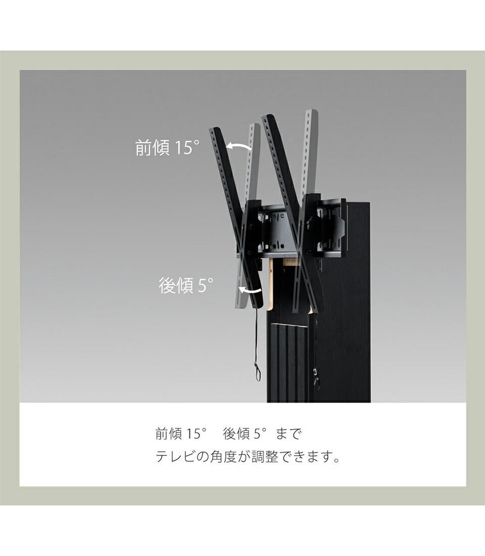 北海道、沖縄・離島のお届けは追加送料を頂きます。ご注文後、当店より別途メールにてお見積りさせて頂きます。 商品説明 シンプルで色々なインテリアに馴染む木目調の壁寄せTVスタンド。40〜65V対応。サウンドバー用の棚板が付属しています。(取り外して使用も可能)TVの上下角度調節(前傾15° 後傾5°)背面にはHDDなどの小物収納スペースがあります。棚板後方には配線用穴があり、配線コードが目立ちません。棚板の取り外し時は、柱前面板を移動させて配線穴を隠すことができます。