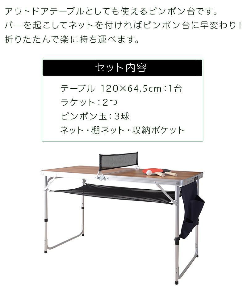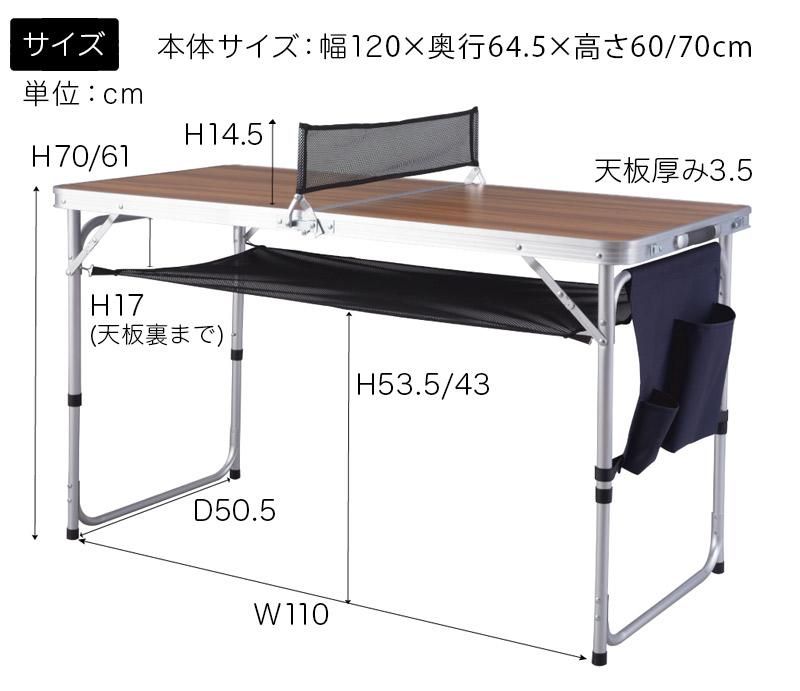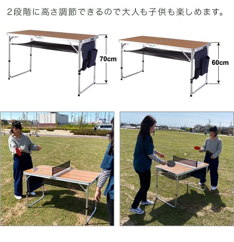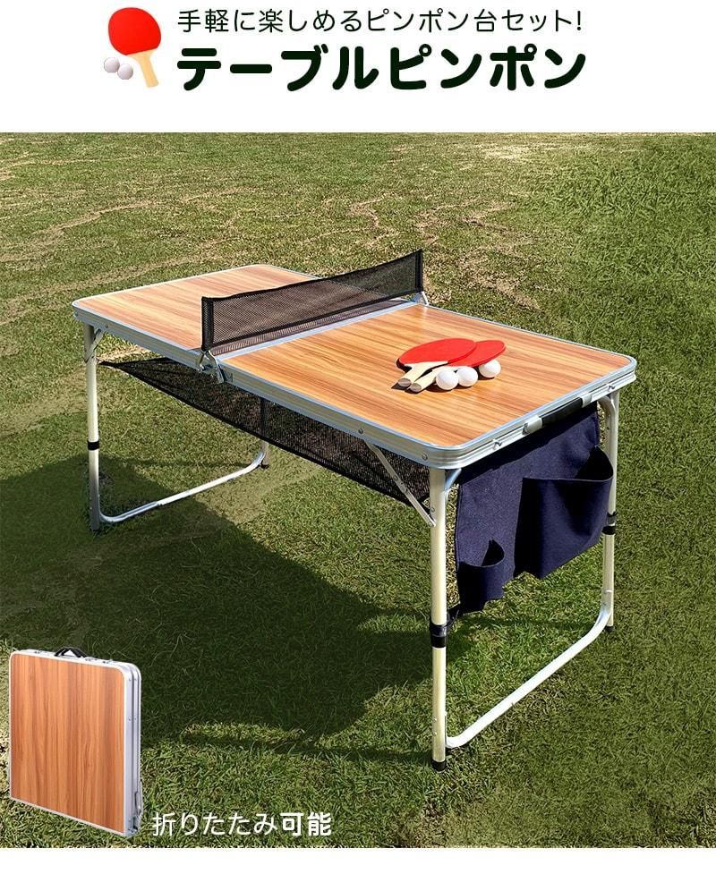 お部屋や自宅の庭でも使える小型のピンポン台です。アウトドアテーブルとしても使えます。バーを起こしてネットを付ければピンポン台に早変わり。折りたたんで楽に持ち運べるので、キャンプなどに持ち込んでみんなで楽しめます。2段階で高さ調節ができます。
