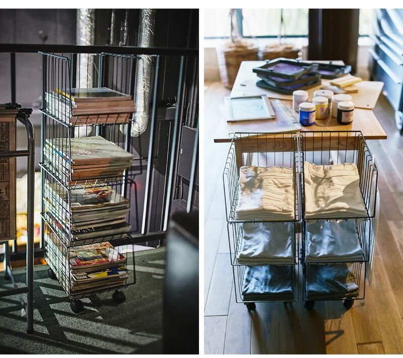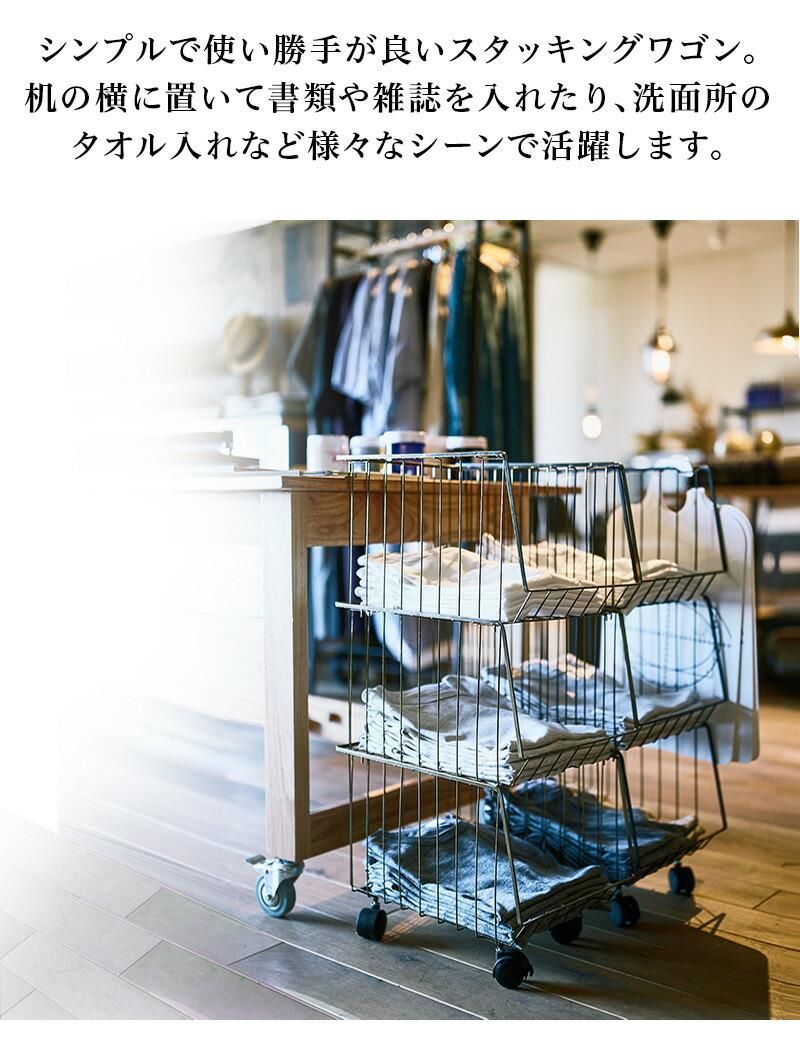 積み重ねができるスチール製スタッキングワゴンです。使わない時はコンパクトに収納できます。デスクの横の雑誌やおもちゃ収納、洗面所のタオルや洗濯物などの色々なシーンでおすすめ。キャスター4つのうち2つがストッパー付きキャスターなので安心です。