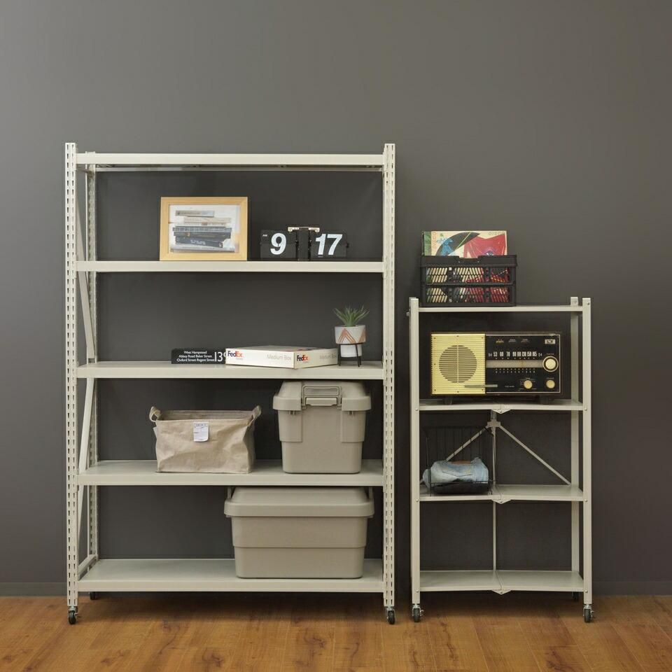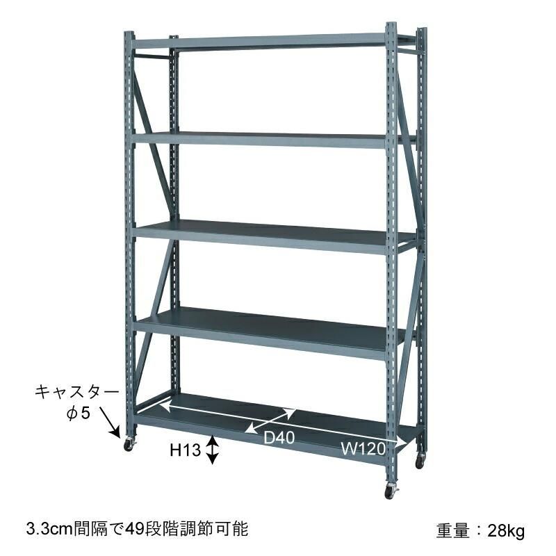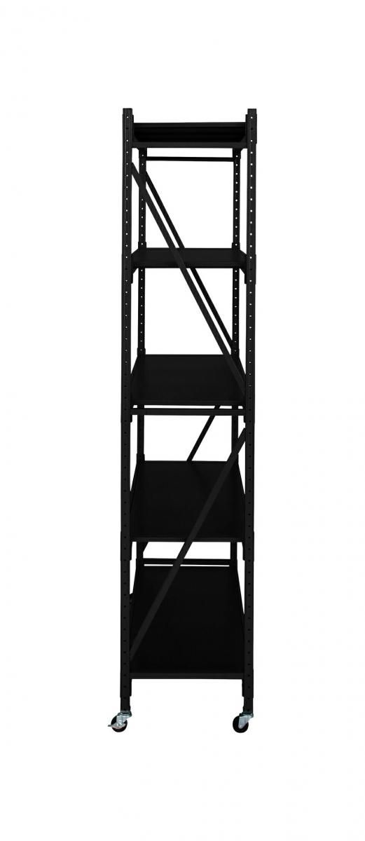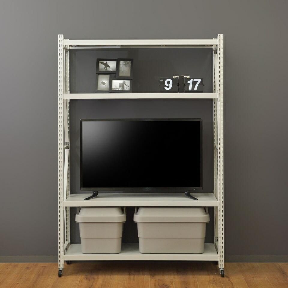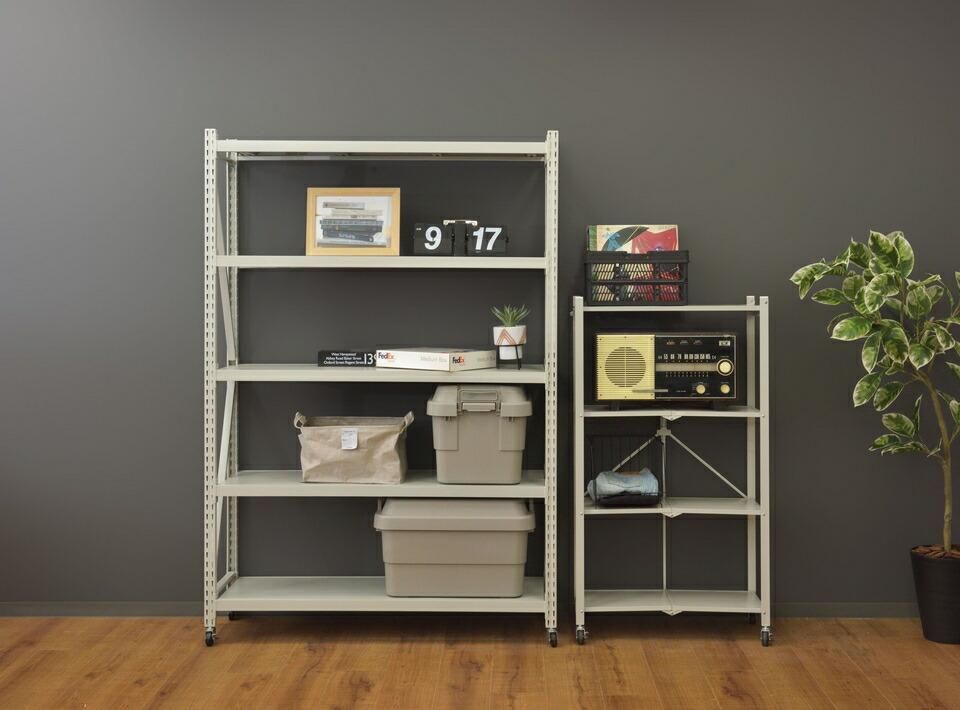 無骨さを取り入れたラックボルトレスラックはボルトが不要なので簡単に組立て、棚移動が行えます。キャスターも付いているので、移動も容易にできます