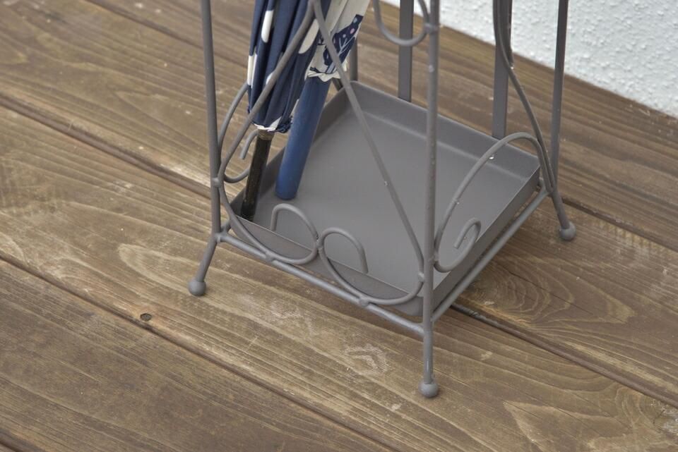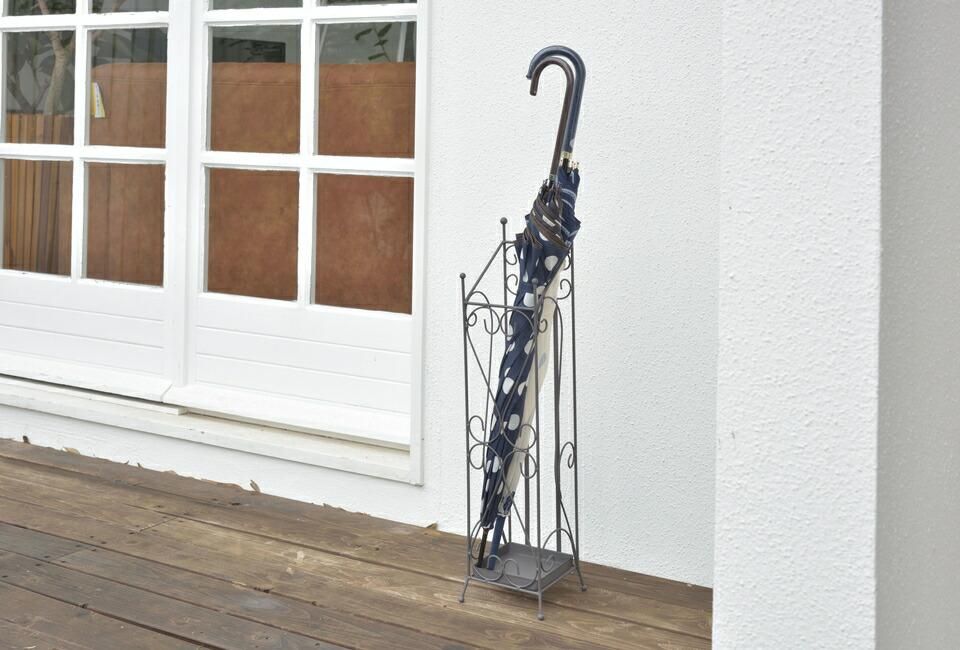 アイアンの傘立、スチール製です。細くて繊細なデザインが特徴のアンティーク風なアンブレラスタンド。かわいくカールしたデザインで玄関のイメージを損ないません。
