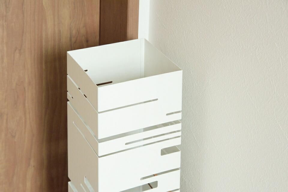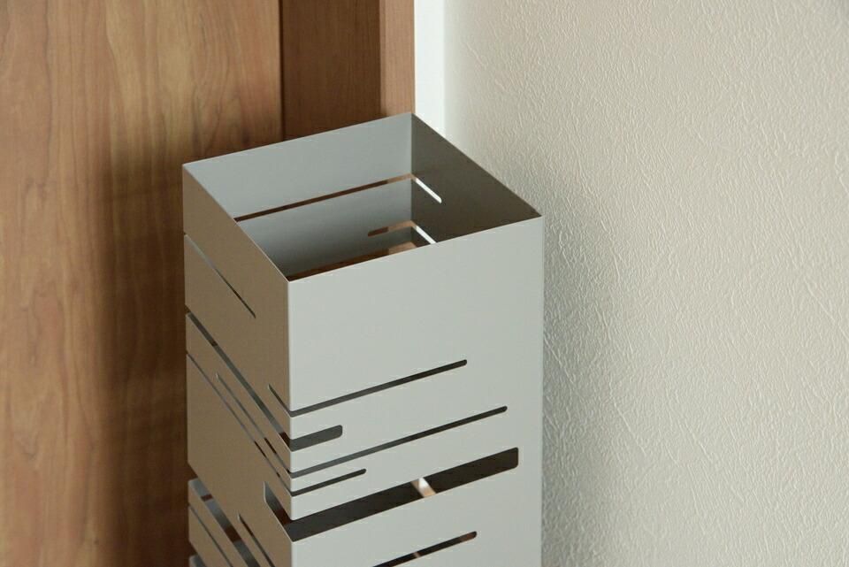 直線的なデザインの型抜き大小様々に施した、シンプルながらインテリア性の高い傘立て。スクエアタイプで安定感があり、水受けトレイが付きで水滴が漏れ出す心配がなく、お手入れも簡単。ご自宅やオフィス、エントランスの傘立て、アンブレラスタンドに最適。