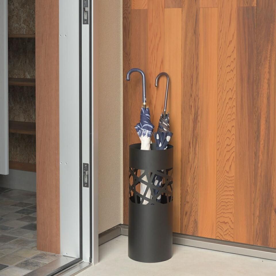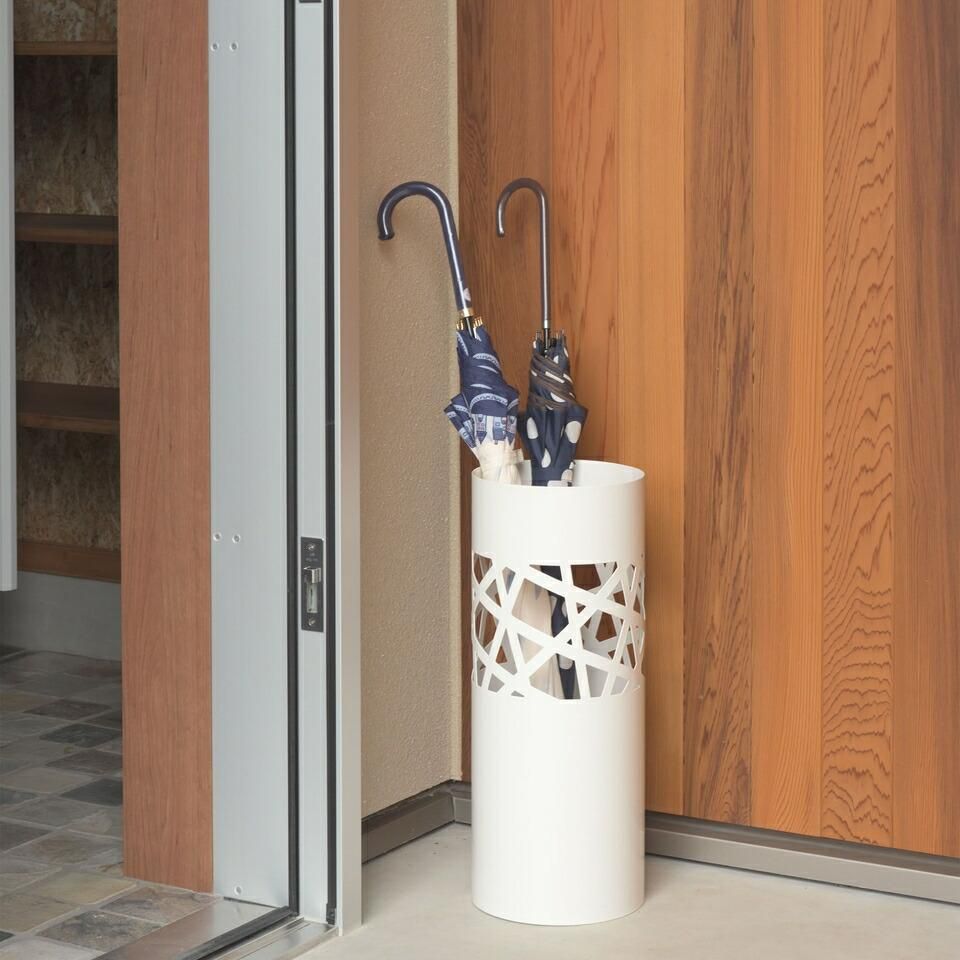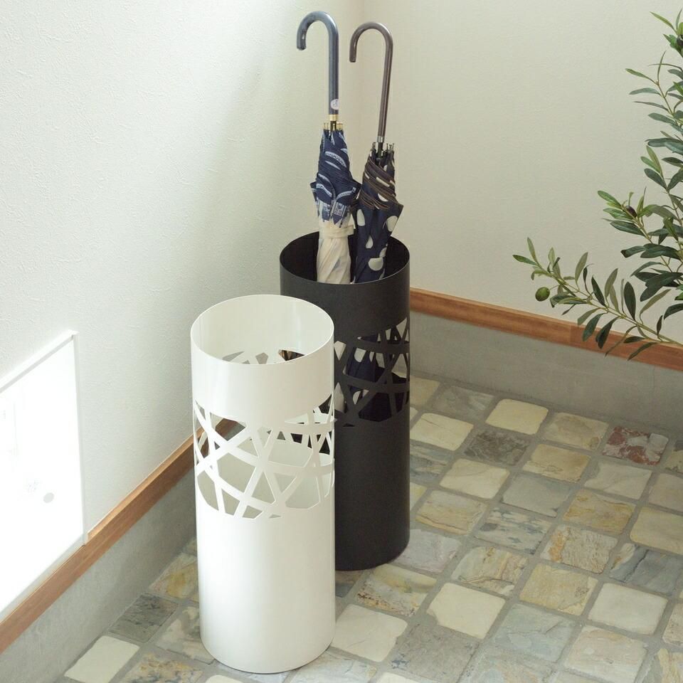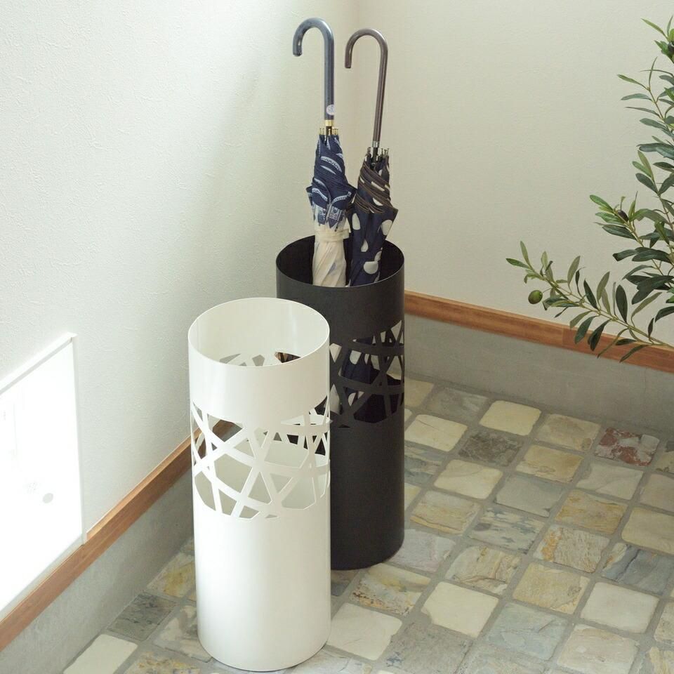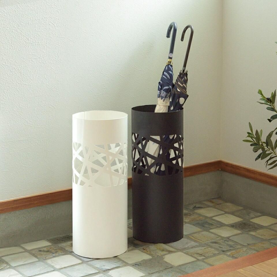 デザイン性のある型抜きを大小様々に施した、シンプルながらインテリア性の高い傘立て。円柱タイプで安定感があり、水受けトレイが付きで水滴が漏れ出す心配がなく、お手入れも簡単。ご自宅やオフィス、エントランスの傘立て、アンブレラスタンドに最適。
