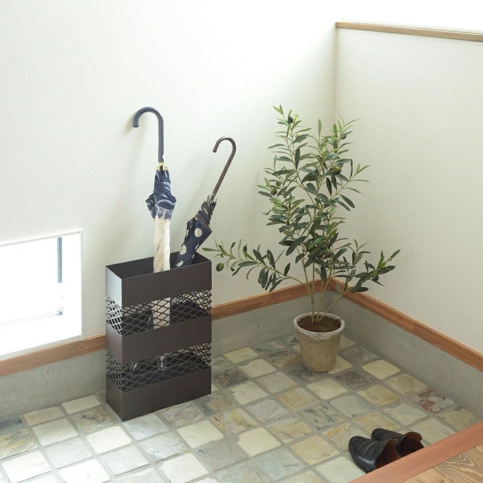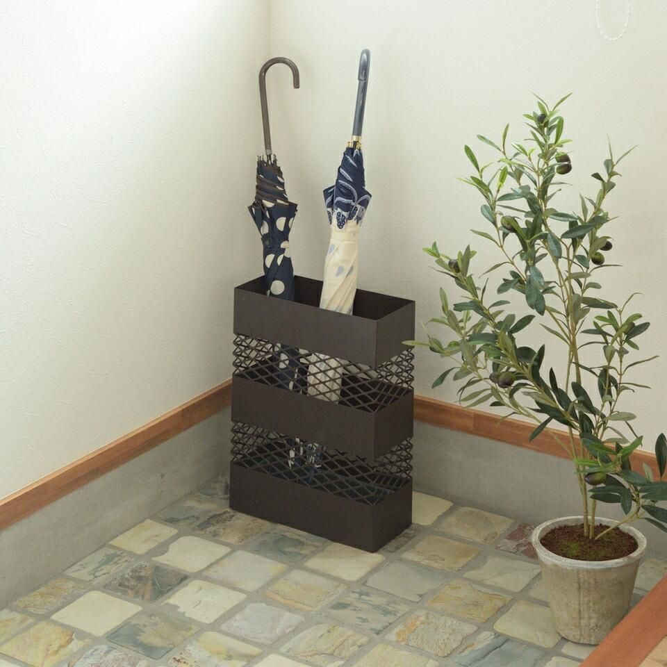 ■備考傘立て 網目 デザイン シンプル インテリア スクエア 安定 トレイ 水滴 手入れ 簡単 自宅 オフィス エントランス スリム おしゃれ 水受けトレー付 スチール ブラウン 法人 会社 角型 モダン 傘置き アンブレラスタンド アイアン コンパクト
