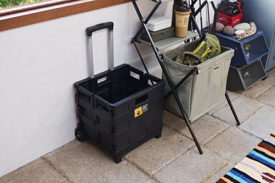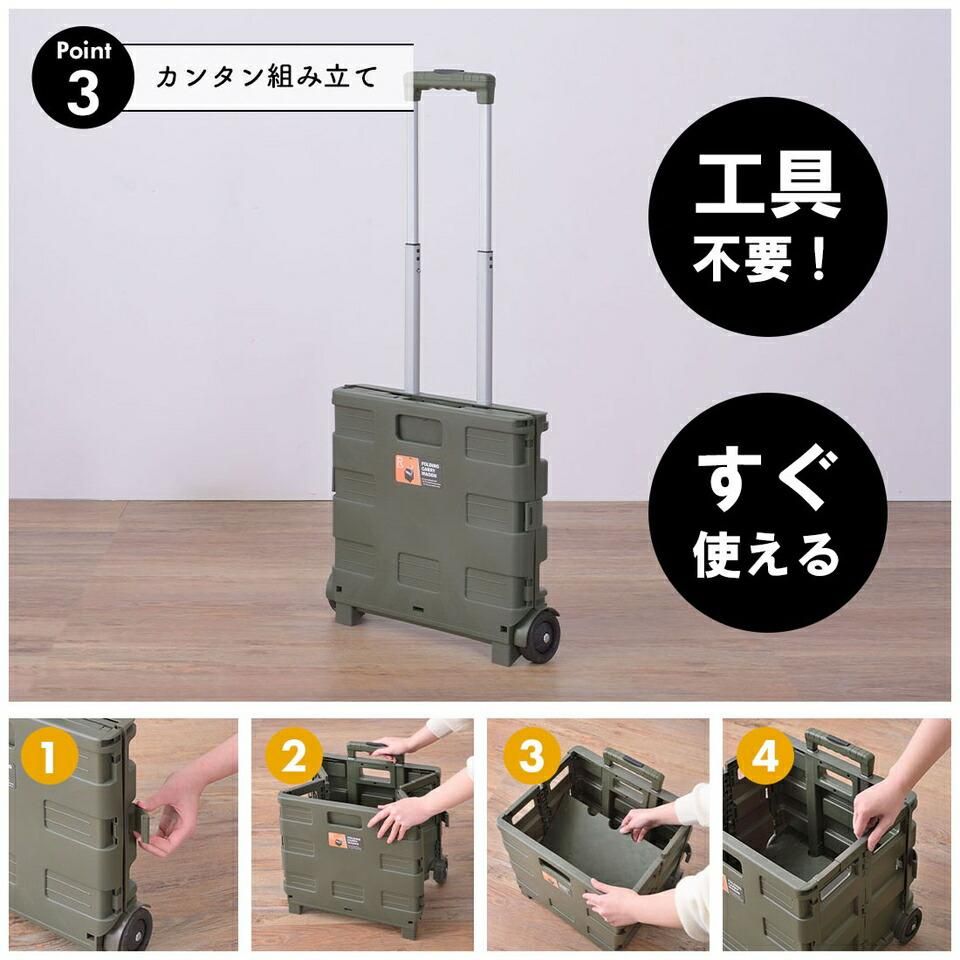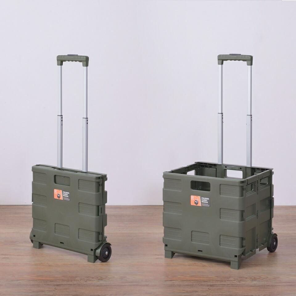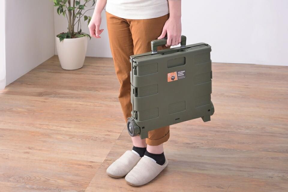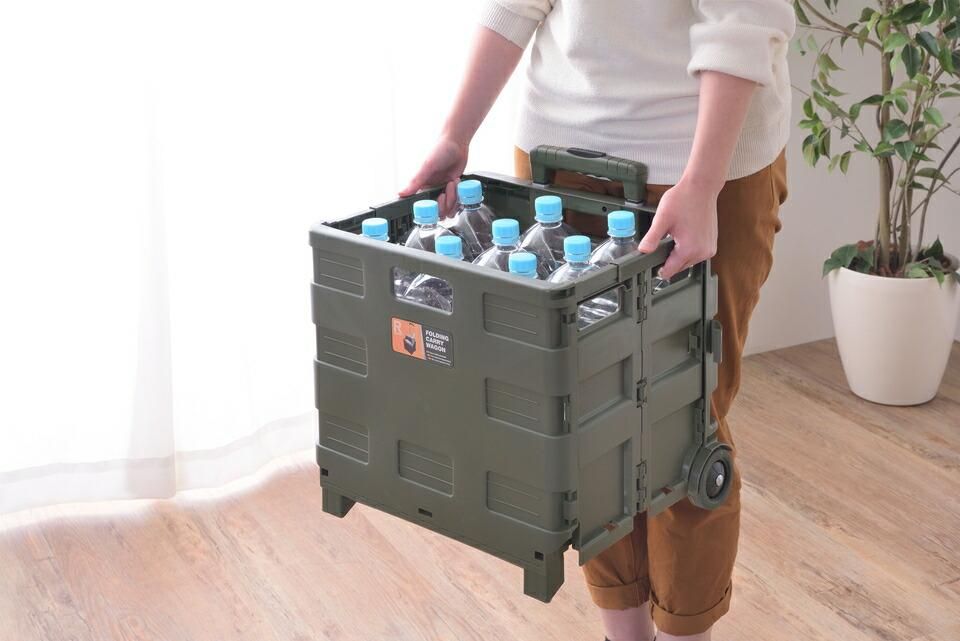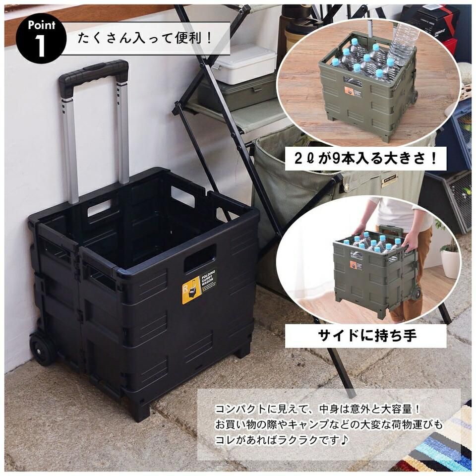 2Lのペットボトルが9本分も入る収納力が自慢の大容量タイプ。ワゴンの内寸は幅35×奥行27.5×高さ30cmと、高さもしっかりと確保したサイズ。長さのある物も含めてたっぷり詰め込めるワゴン。ワゴン本体にキャスターが2つ付いているので移動もラクラク。アウトドア・キャンプ・レジャーから、ちょっとした買い物や運動会等のイベント等に幅広く使える便利なワゴン。本体の側面上部には【持ち手】が付いているので、段差のある場所やキャスターでは移動できない場所でも持ち運びしやすい仕様。持ち手の角は丸く仕上げてあるので、指への負担を和らげる仕様。フォールディング(折りたたみ)タイプのキャリーワゴンは、折りたたんだ時の厚さはたったの9cm。使わない時は玄関の片隅や車の中にすっきりと収納しておけるサイズ。折りたたんだ状態から組み立てまで、工具不要でとっても簡単。