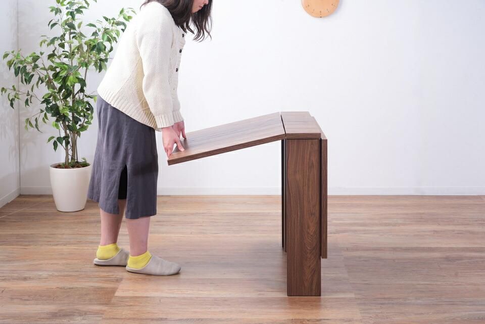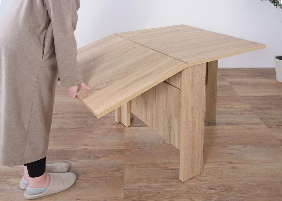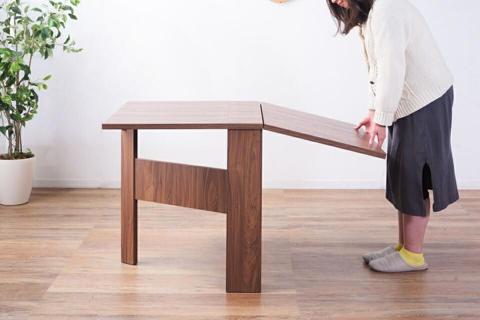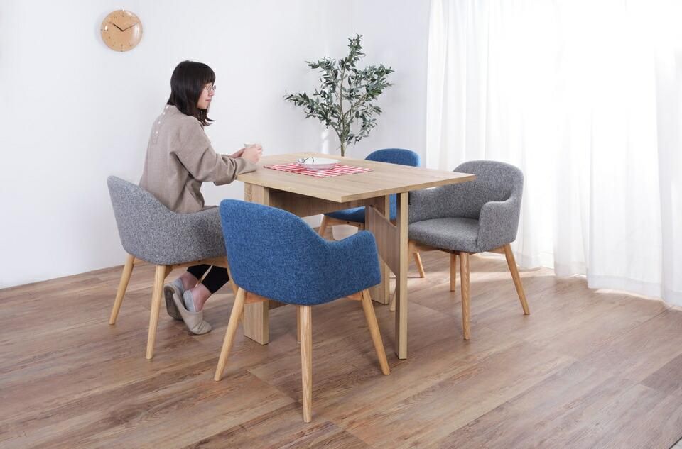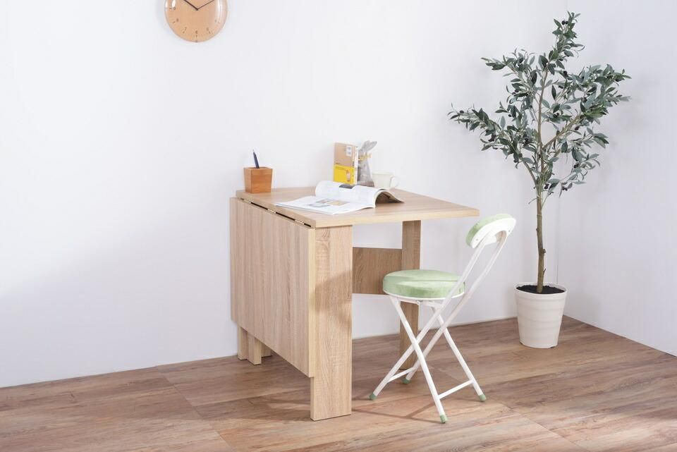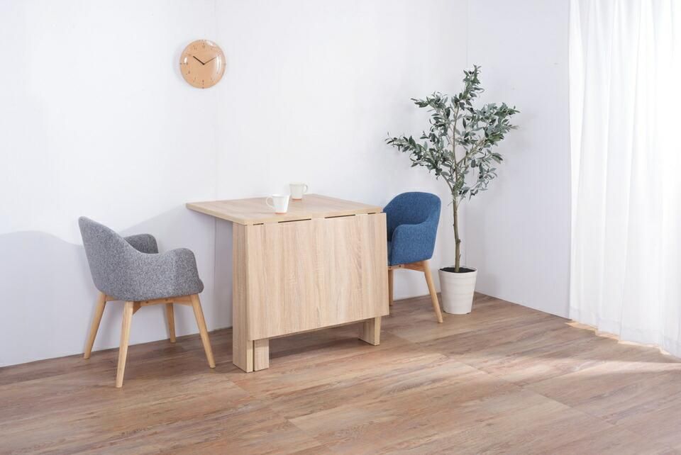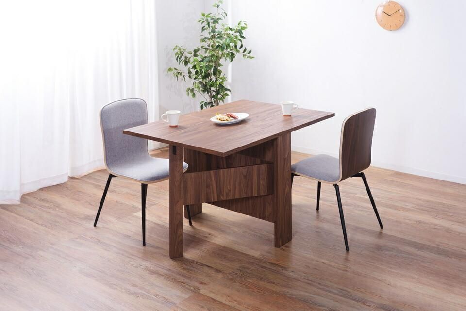 天板を広げたり折りたたんだり、使い分けが可能なダイニングテーブル。片開き時は2人用テーブルやデスクとして。両開き時は4人用テーブルして使えます。天板は折りたたんで収納可能。幅約20.5cmととってもコンパクト。天板を広げたときはは両サイドにあるロックで簡単に固定。使用中に天板が閉じたりガタつく心配もありません。テーブル本体には木目調の強化プリント紙化粧合板を使用。天然木・無垢材では難しい「統一感」を実現。強化プリント紙化粧合板は汚れに強くお手入れが簡単なのでいつでも清潔。弾力のある床キズ防止クッションが脚裏全体に張られているのでフローリングの使用でも安心。