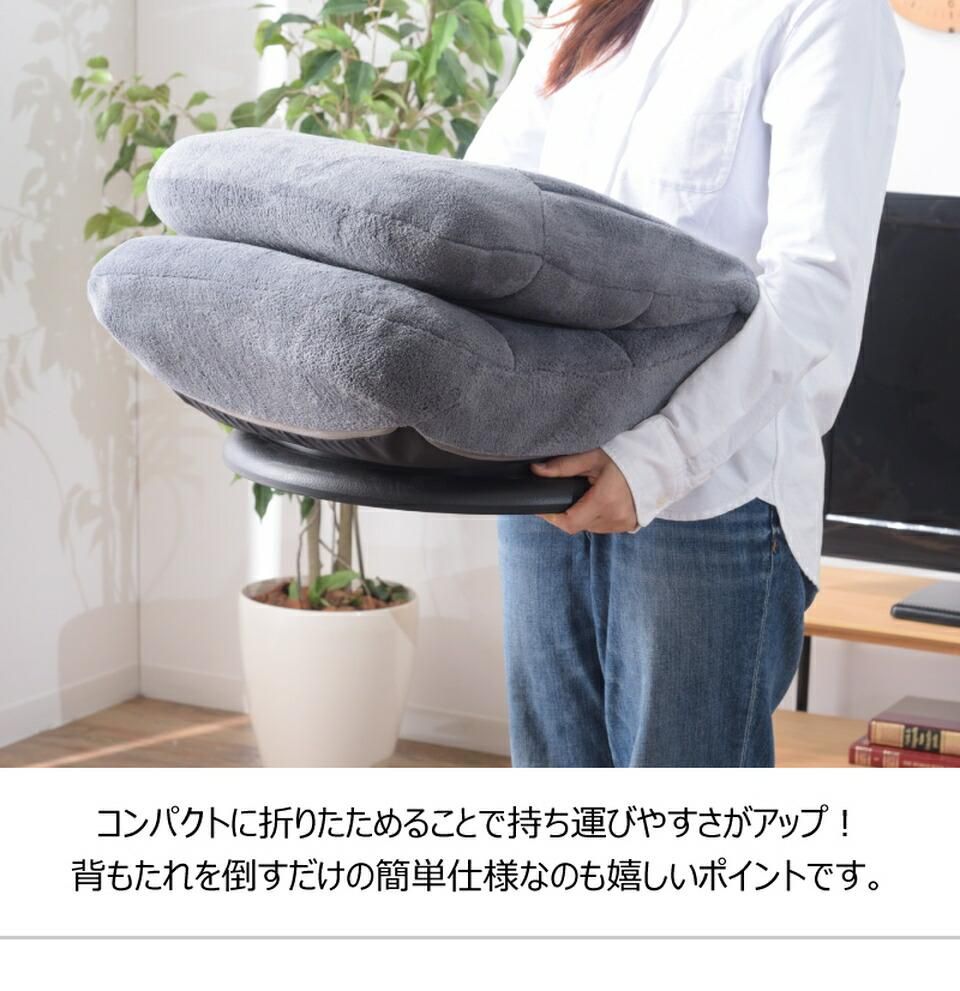 360度回転して、立ち座りが楽な座椅子です。 手触りの良い起毛タイプの生地を利用し、座面が身体のラインに合わせた曲面で、身体にフィットするフロアチェア。座椅子としては、めずらしい折りたたみタイプでコンパクトに収納出来ます。