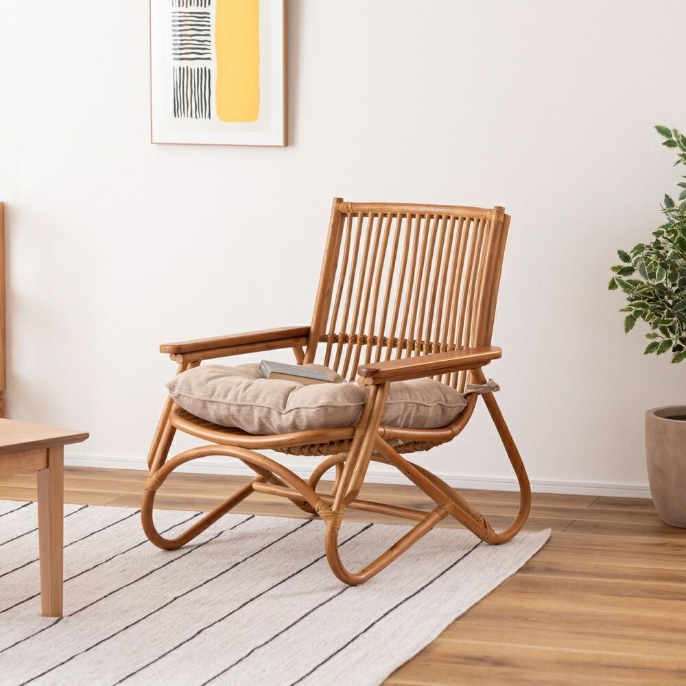 脚のカーブが美しい、天然木×ラタンのパーソナルチェア。ゆったりと座りやすい形状と、印象的なデザインが特徴です。肘掛けには天然木(チーク)を使用。天然木のぬくもりがしっかりと手に馴染みます。ラタン(籐)ならではの、しなやかで柔らかい曲線も魅力の一つです。背もたれには緩いカーブを掛けているので、ゆったりとくつろぐことができます。ほどよいクッション性のある座面クッションは取り外しが可能です。