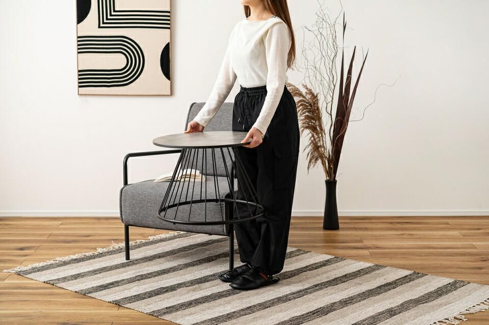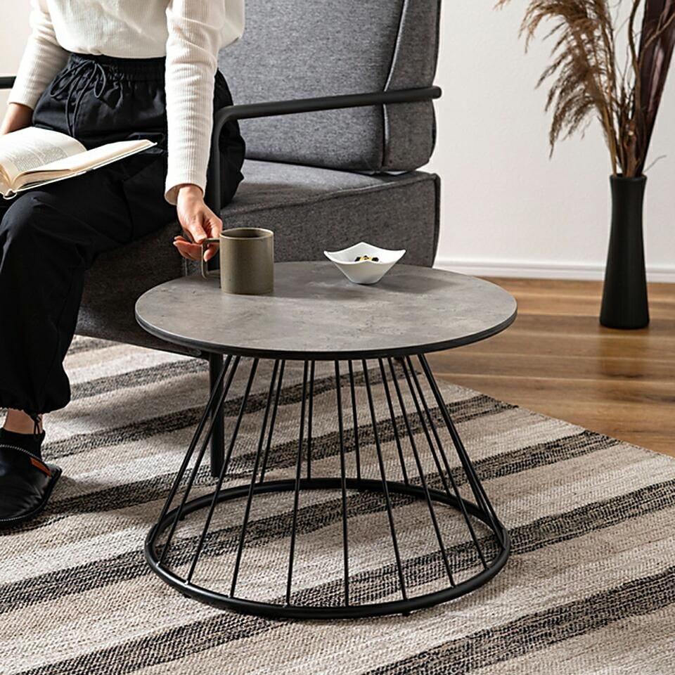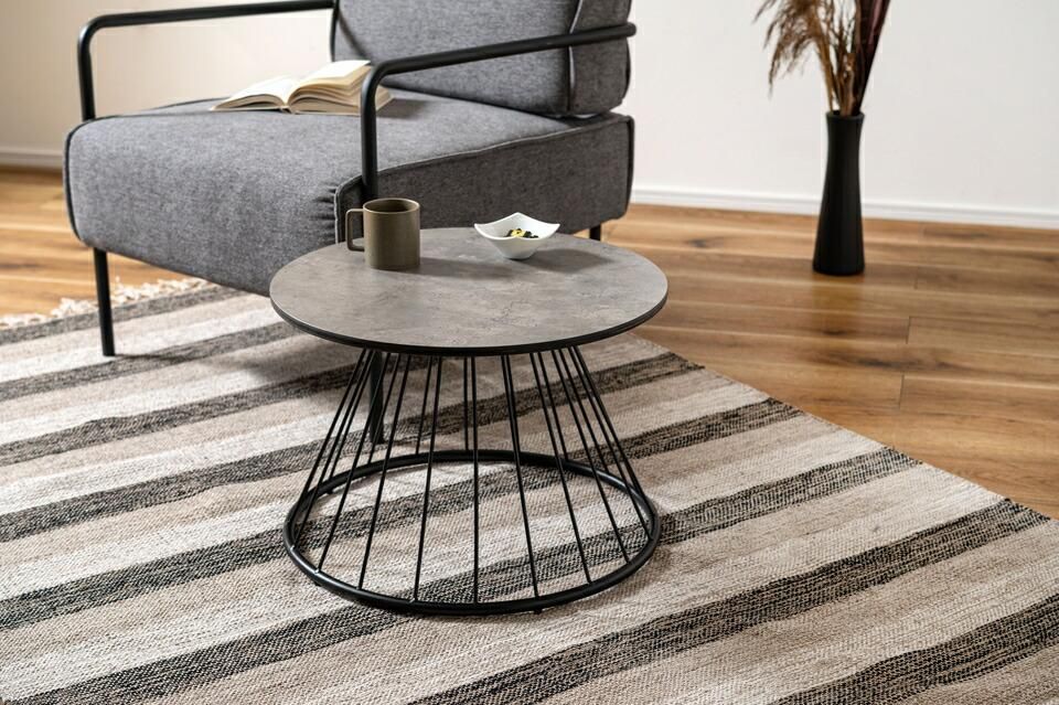 空間を美しく魅せるラウンドテーブル。中央に向かって伸びる細いブラックスチールの脚部が特徴的なラウンドテーブル。サイズ違いの2台を並べて、ネストテーブルの様にも使用して頂けます。モダンでスタイリッシュなデザインが魅力的で、上品な空間を演出します。凹凸をおさえた手触りの石目調天板。細く美しいブラックスチールの脚部。お手入れが簡単、床への傷を防止する保護キャップ付き。