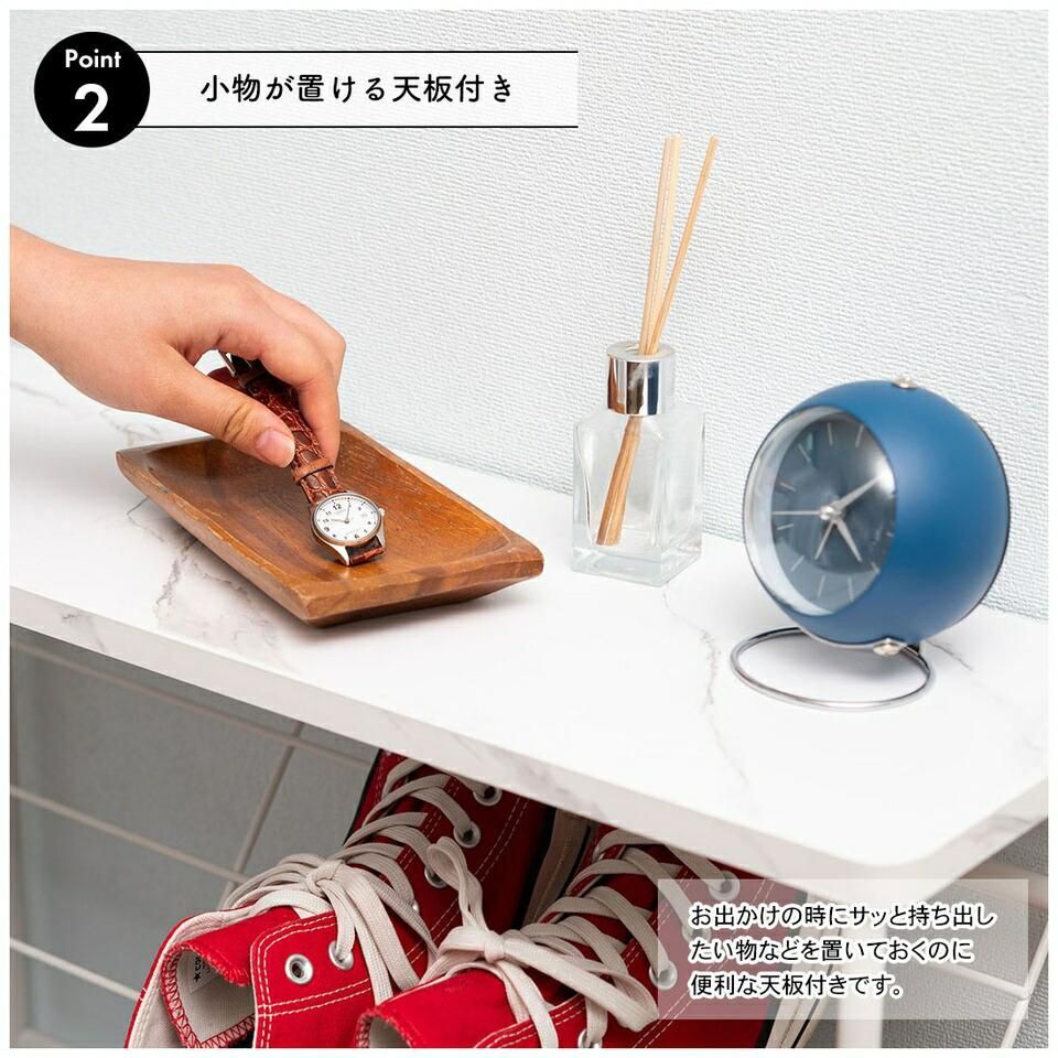 シックな石目調天板とスチールを組み合わせた、スタイリッシュですっきりと収納できるシューズラック。匂いや湿気がこもらない通気性の良いオープンタイプ。天板は十分なスペースがある為、小物置きやインテリアのディスプレイに。収納棚が斜めになっているので、ハイカットの靴も入れやすくサッと取り出しやすい設計。お出かけの時に必要な小物置きやインテリアのディスプレイ台にもなる天板付き。奥行23.5cmのスリム設計で狭い玄関でも場所を取らない省スペースデザイン。天板は石目調デザインで、シンプルな中にもおしゃれなアクセントに。斜めの収納棚を利用して雑誌などのディスプレイラックとしても。(収納目安:9足)