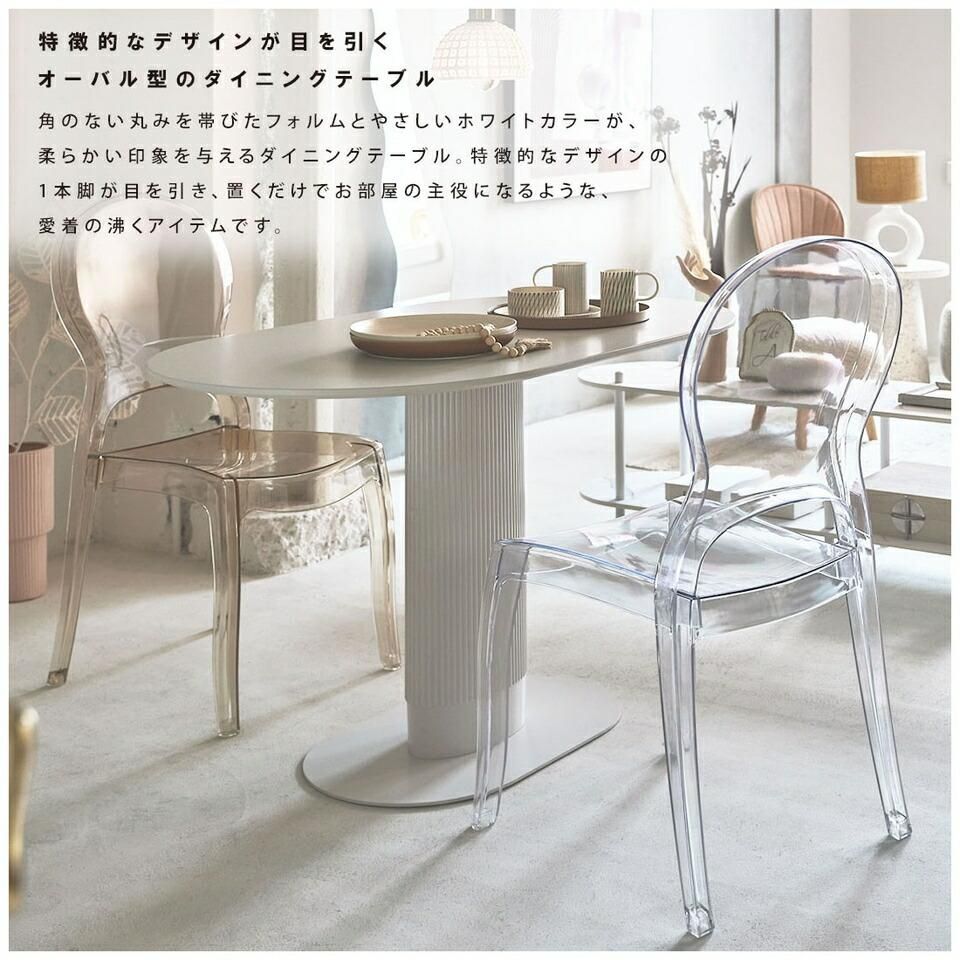 特徴的なデザインが目を引くオーバル型のダイニングテーブル。角のない丸みを帯びたフォルトと優しいホワイトカラーが柔らかい印象を与えるダイニングテーブル。特徴的なデザインの1本脚が目を引き、置くだけでお部屋の主役になるような愛着の沸くアイテム。全体的に角を落とした丸みを帯びたフォルムが可愛らしさを演出。脚部の特徴的なデザインが全体を引き立てます。テーブルの上に置いたものがよく映える、綺麗なホワイトカラー。