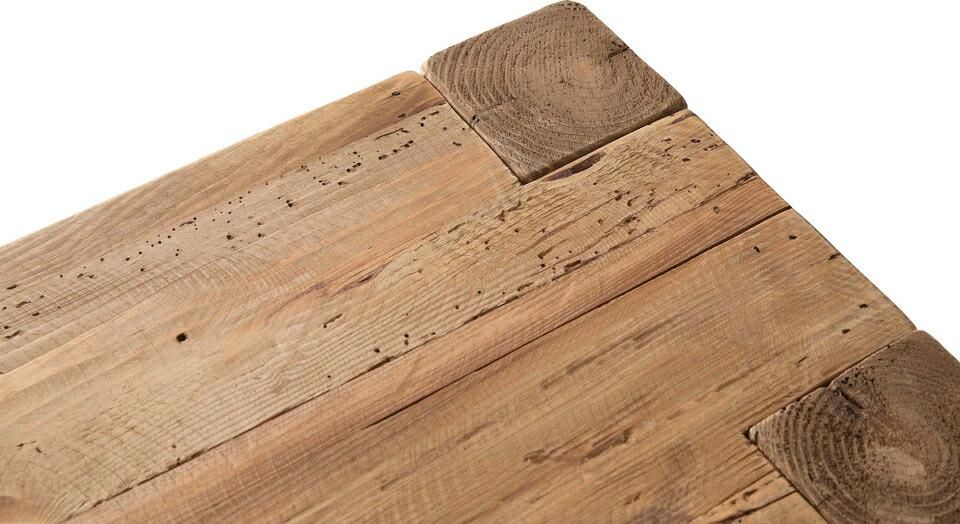 厚みのある天然木パイン古材を利用したテーブル。素材に古材を使用しておりますので、木部の虫食い穴や傷、亀裂などがありますが、世界に二つとない個性的な机で、お部屋に存在感を持たせます。