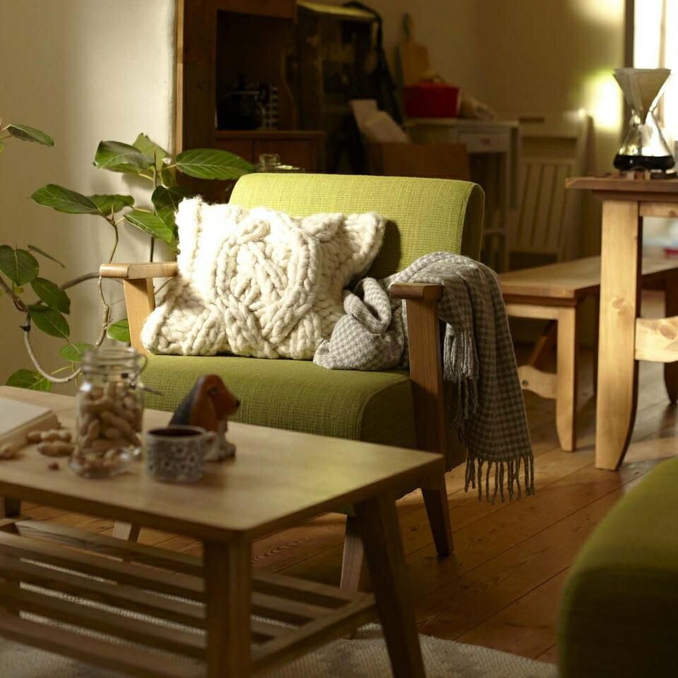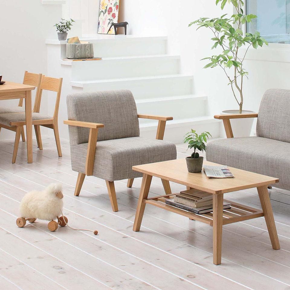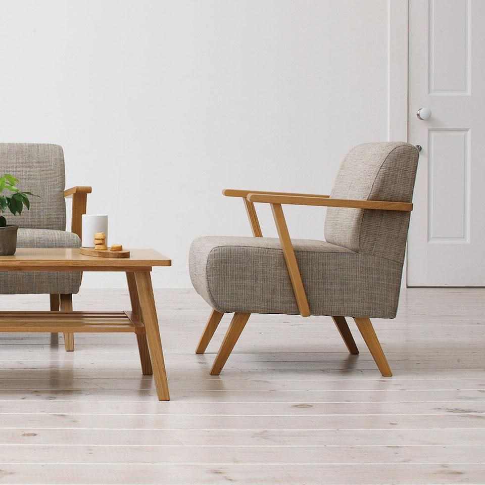 天然木とコットンツイードを使用したシンプルなデザインのソファ。高級感もあり、ナチュラルな北欧風の空間を演出できます。お洒落なカフェにいるようなリラックスタイムを演出します。座面は固めの低反発のような座り心地で、木目の美しい天然のアッシュ材を使用した肘掛けと脚が特徴のリビングチェアです。