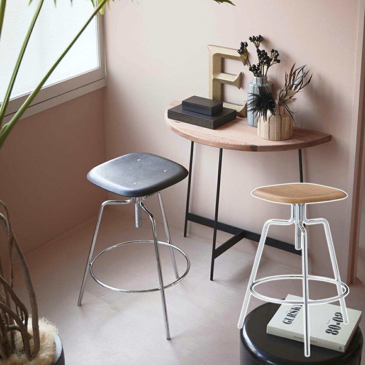 くるくると回すだけで高さ調節できるハイスツールは、カウンターチェアとしてもお使いいただけます。丸みを帯びたスクエアな座面は、ブラック・ライトブラウンから選べる2色。