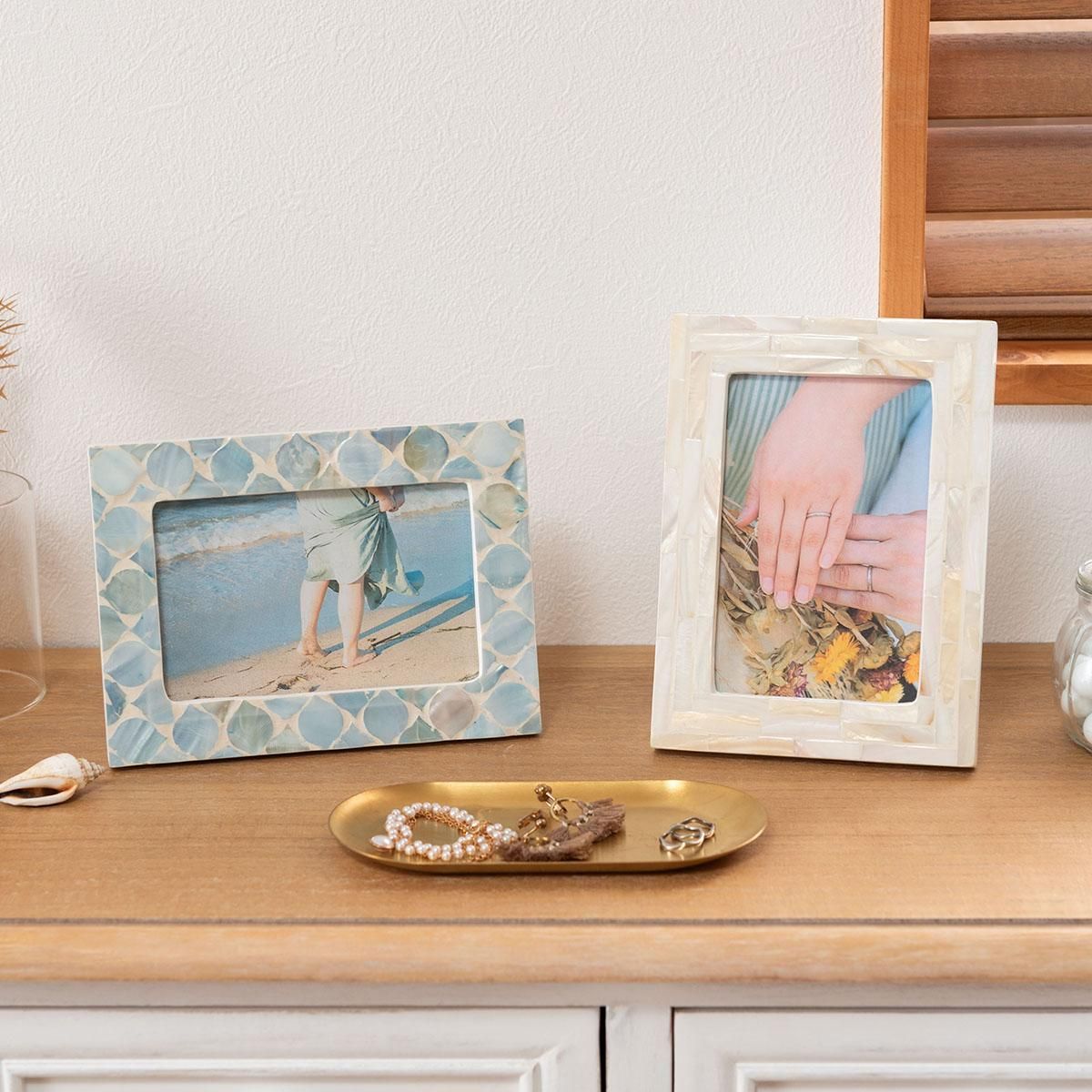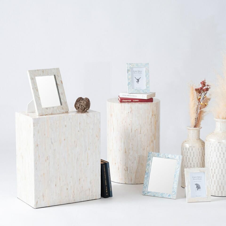 透明感と独特な光沢が演出する,マザーオブパールシェルインテリアシリーズ マザーオブパールはその名の通り真珠を育む貝で真珠のような虹色に輝く光沢が特徴です。古くから時計の文字盤や楽器、雑貨の装飾に使われてきました。一点一点丁寧に手貼りされ、シンプルで上品な印象に仕上げることで現代のインテリアにマッチするようデザインしました。