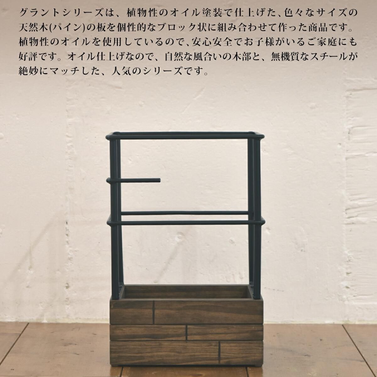 グラントシリーズは、植物性のオイル塗装で仕上げた、色々なサイズの天然木(パイン)の板を個性的なブロック状に組み合わせて作った商品です。植物性のオイルを使用しているので、安心安全でお子様がいるご家庭にも好評です。オイル仕上げなので、自然な風合いの木部と、無機質なスチールが絶妙にマッチした、人気のシリーズです。
