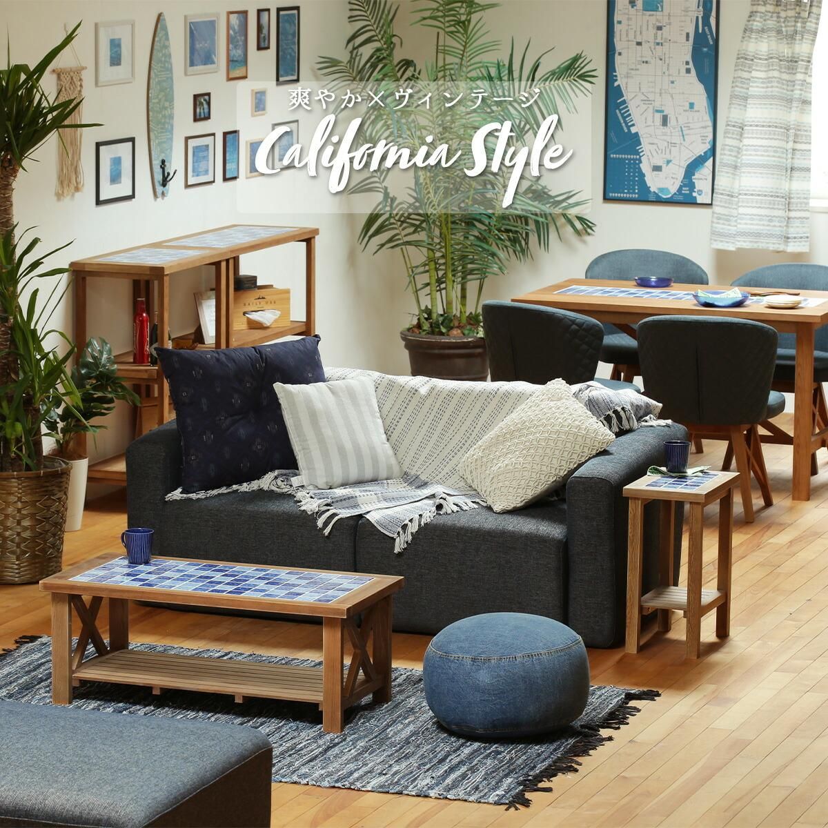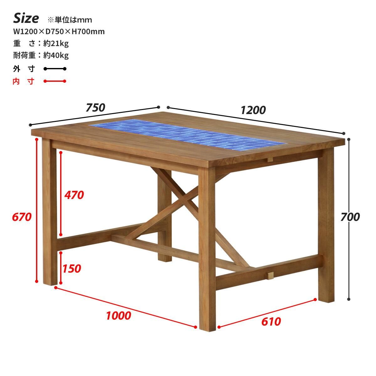 ヴィンテージな雰囲気の天然木フレームに鮮やかで、海を思わせる3色のタイルが敷き詰められたダイニングテーブル。120cm幅と十分なサイズがありご家族でのお食事やカフェなどのお店にもおすすめです。同シリーズのダイニングチェアと揃えればお部屋の雰囲気が統一され、明るい西海岸風のダイニングになります。