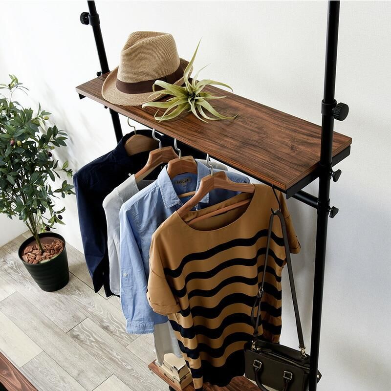 木目調の棚板とハンガーバーは無段階に高さ調節可能。スッキリ収納できるつっぱりコートハンガーです。天井に突っ張って固定させるから、安定感があります。壁や天井を傷つけずに設置できるので、賃貸にもお勧めです。水や汚れに強い化粧繊維板を使用しておりお手入れも簡単。