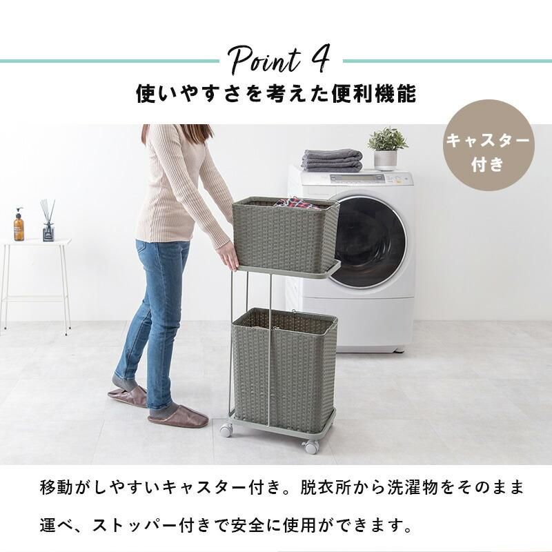 色柄物や汚れた洗濯物を分けて溜められるランドリーワゴン。バスケットは持ち運べて便利。
