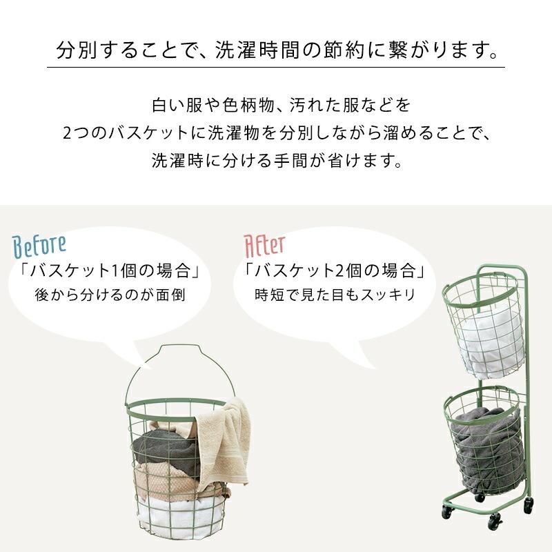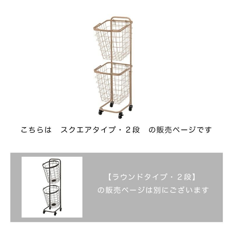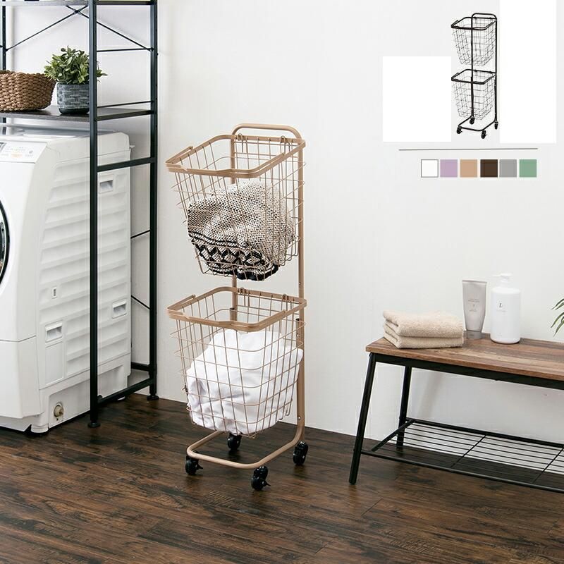 2段ランドリーラック キャスター付 縦型 角型 四角カゴ バスケット カゴ おしゃれ ホワイト グリーン ブラウン ベージュ グレー ピンク 角カゴ