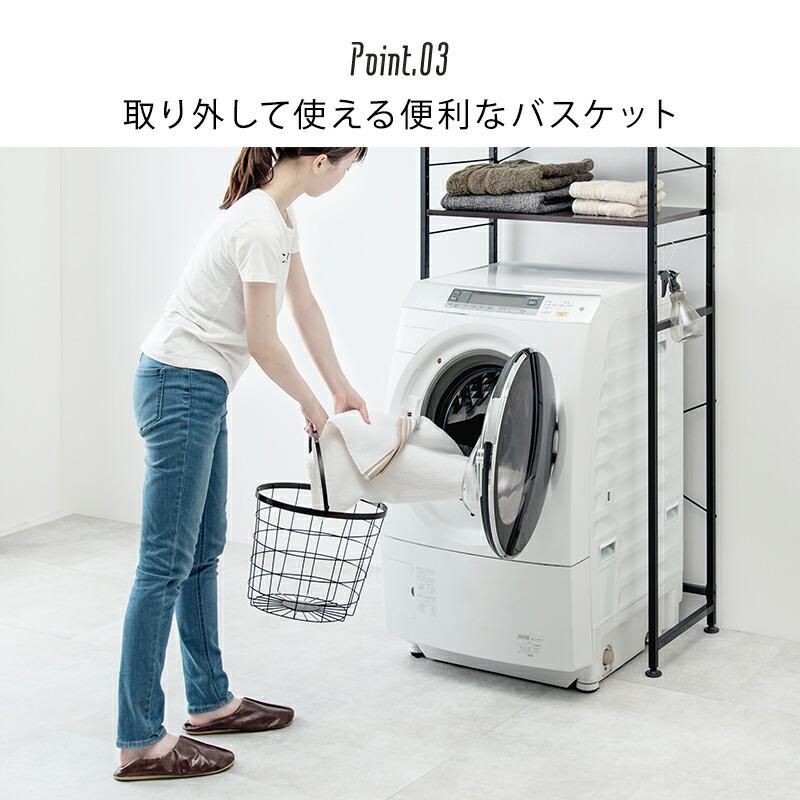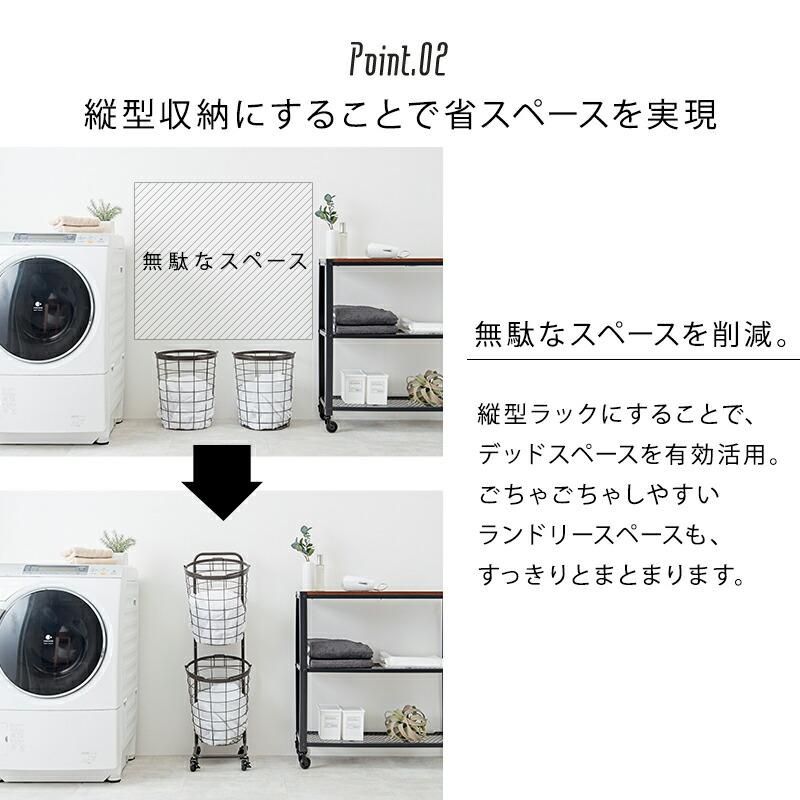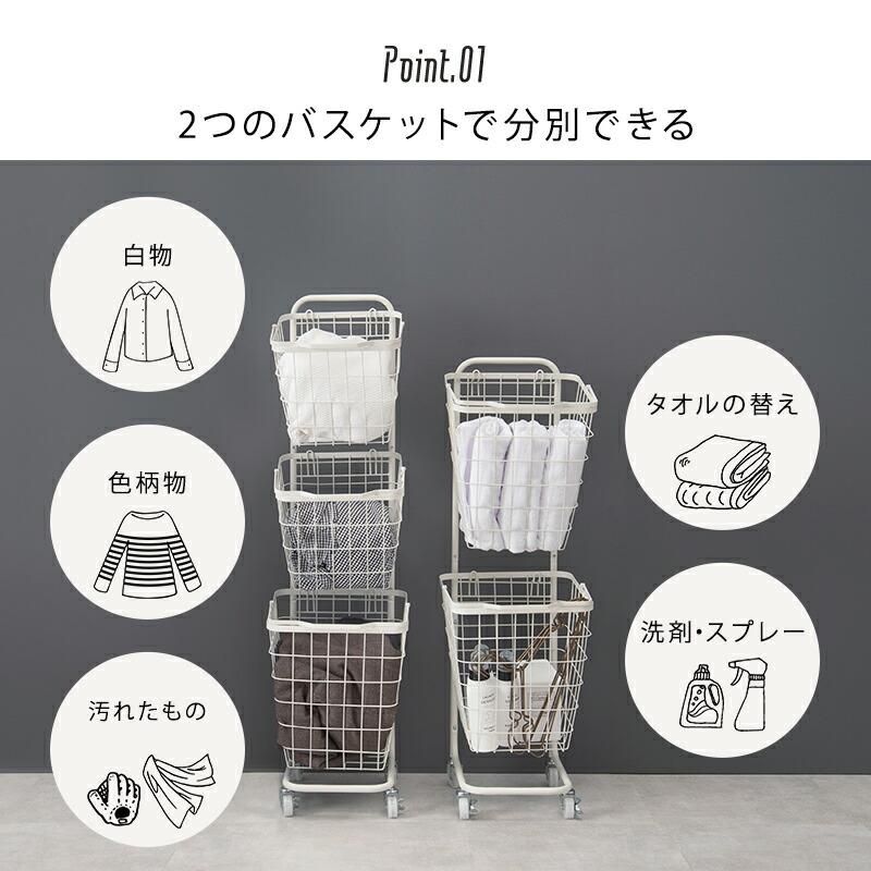 持ち運べるバスケットが便利。縦型収納で省スペースに洗濯物を分別できます。