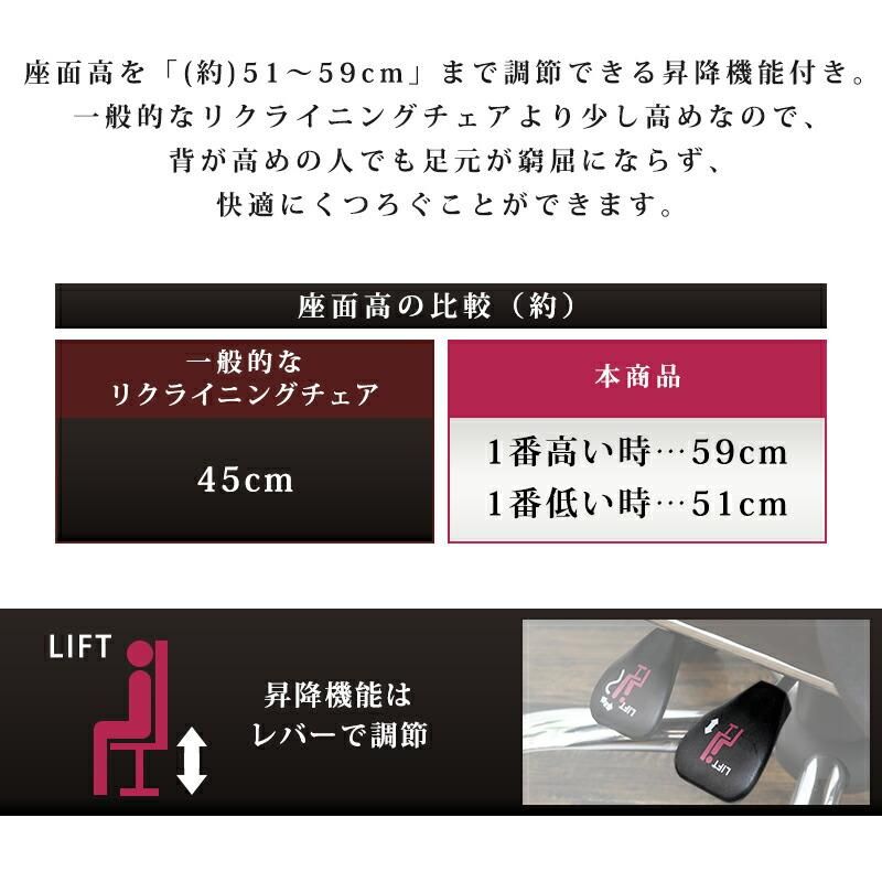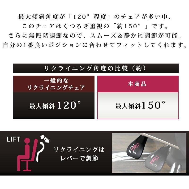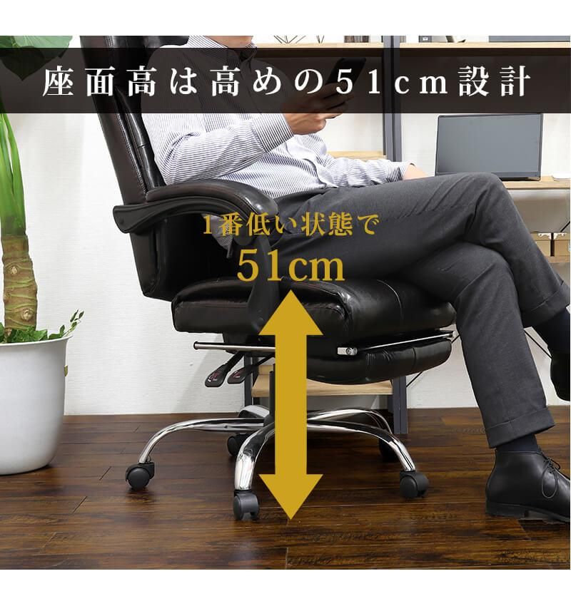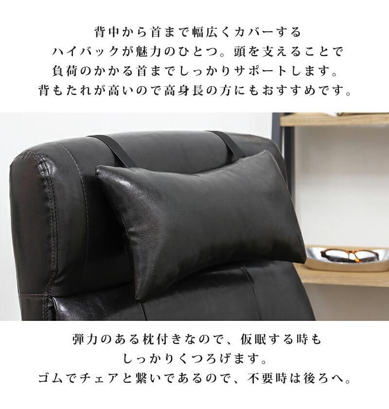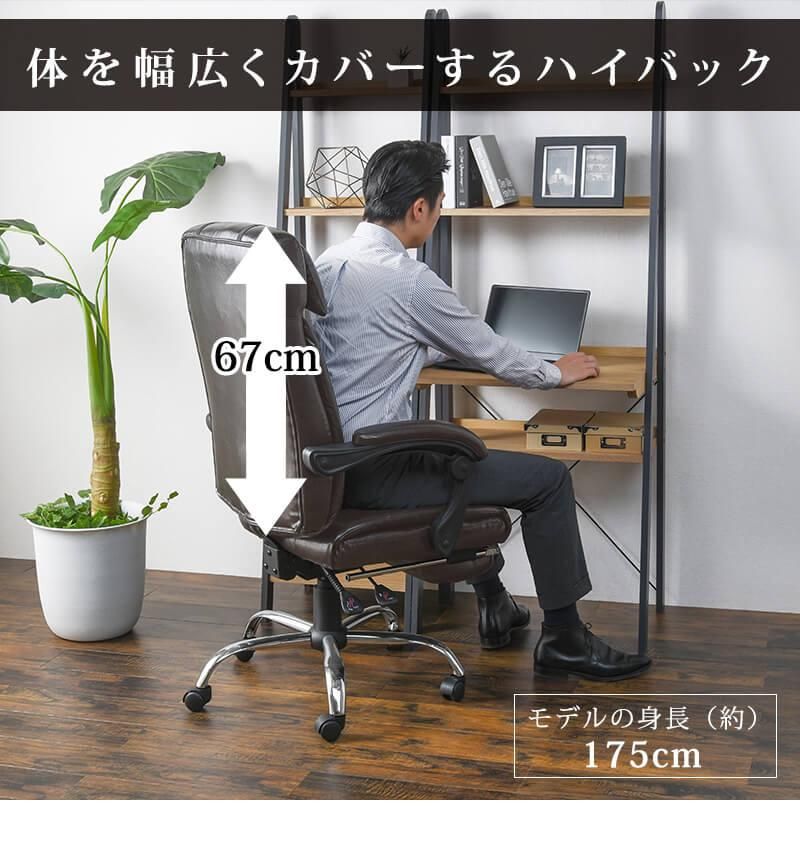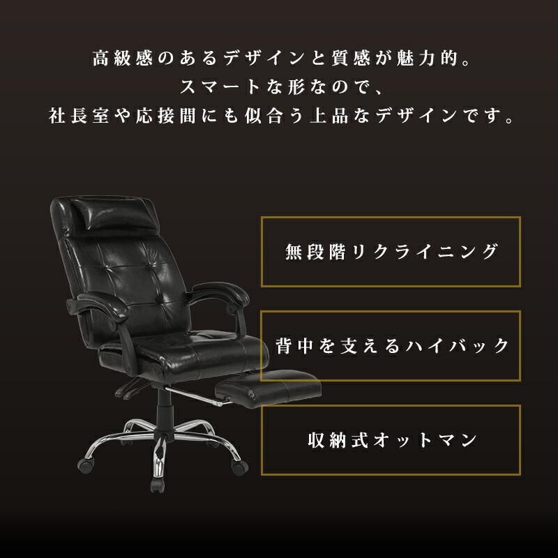 高級感のあるハイバックチェア。リクライニング機能付き。収納できるオットマン付きで仕事の合間にリラックス。