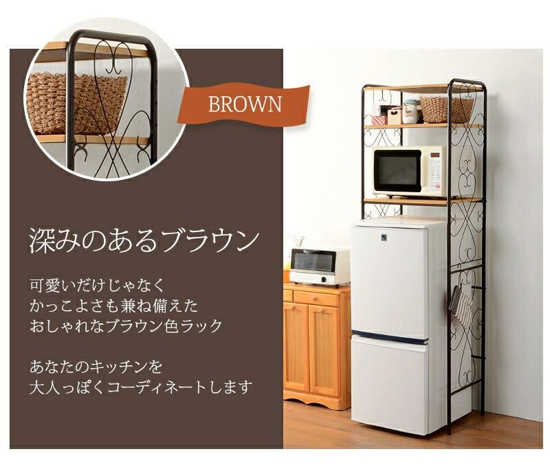 商品説明 アイアンの曲線がエレガントで、冷蔵庫の上を有効活用できる冷蔵庫ラック。