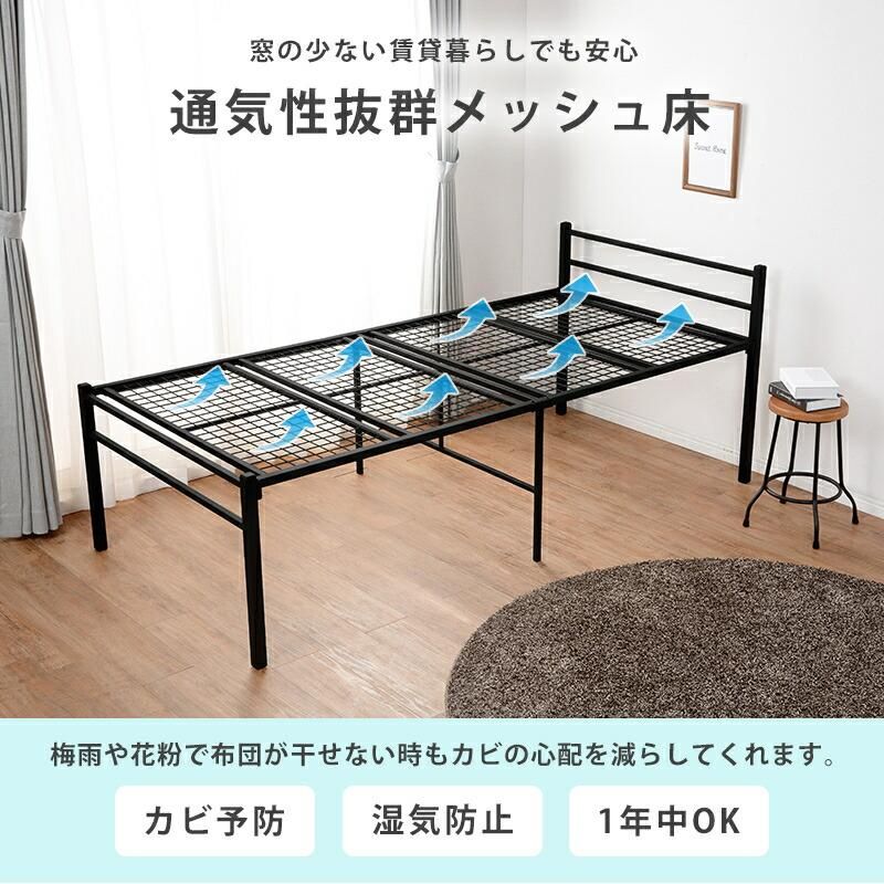 商品説明 通気性の良いメッシュ床板を採用したスチール製シングルベッド。床下の高さが約51cmと広く、収納ケースや荷物が置きやすいのでお部屋の収納力が上がります。