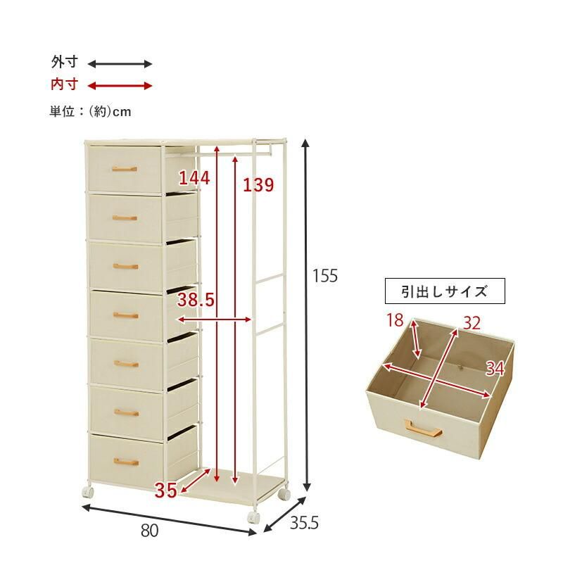 本体サイズ(cm) (約)幅80×奥行35.5×高さ155cm その他サイズ ■引出内寸:約幅34×奥行32×深さ18cm 商品仕様 ■キャスター4個付(内2個ストッパー付)■S字フック5ヶ付 商品重量(kg) フレーム:スチールパイプ、張地:ポリエステル 組み立て お客様ご自身で要組み立て