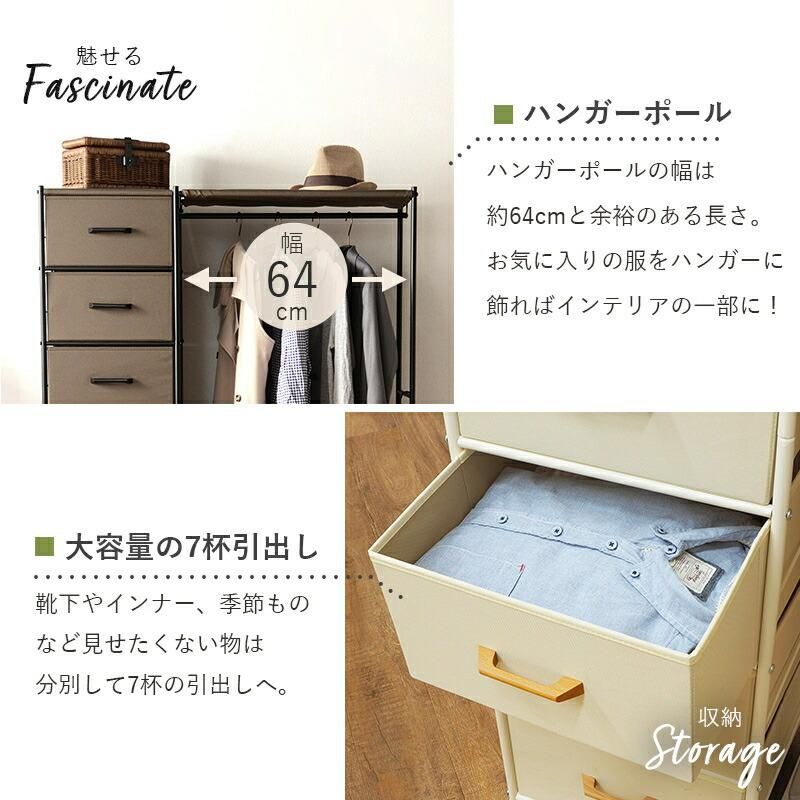 商品説明 シンプルなデザインに引出し収納も兼ね備えたハンガーラック。キャスター付きで掃除や移動にも便利