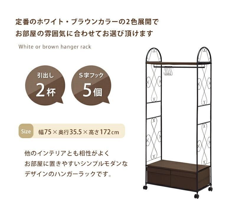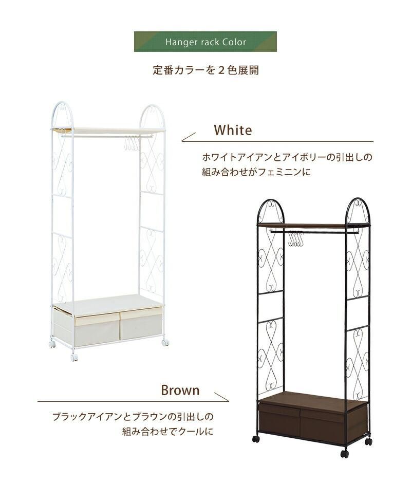 ■ハンガーラック アイアン 一人暮らしワンルーム 収納 コートハンガー 衣類収納 曲線 エレガント 衣類 帽子 小物収納 引出 S字フック付 キャスター スチール■