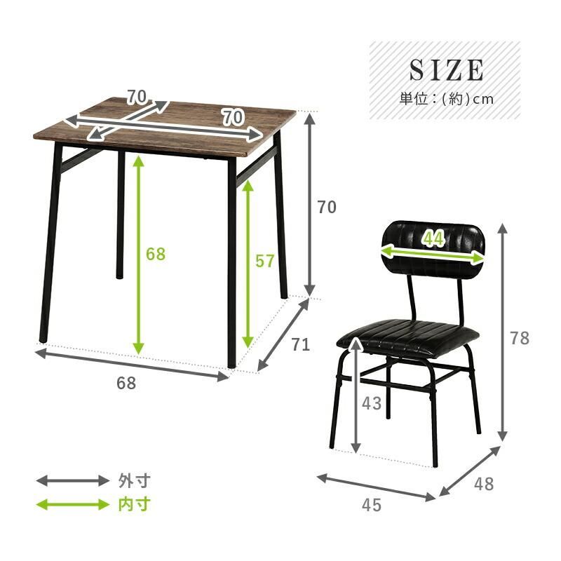 本体サイズ(cm) テーブル:(約)幅70×奥行71×高さ70cmチェア:(約)幅45×奥行48×高さ78×座面高43cm 商品重量(kg) 主材:スチール, 化粧繊維板(塩化ビニル) 組み立て お客様ご自身で要組み立て