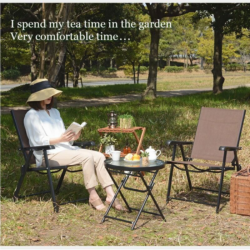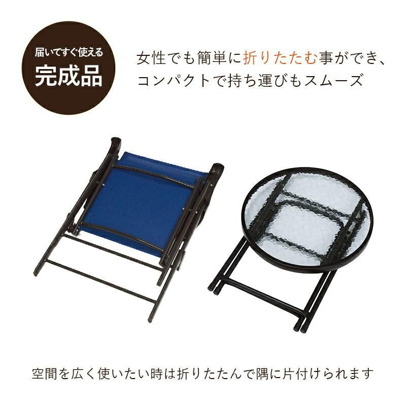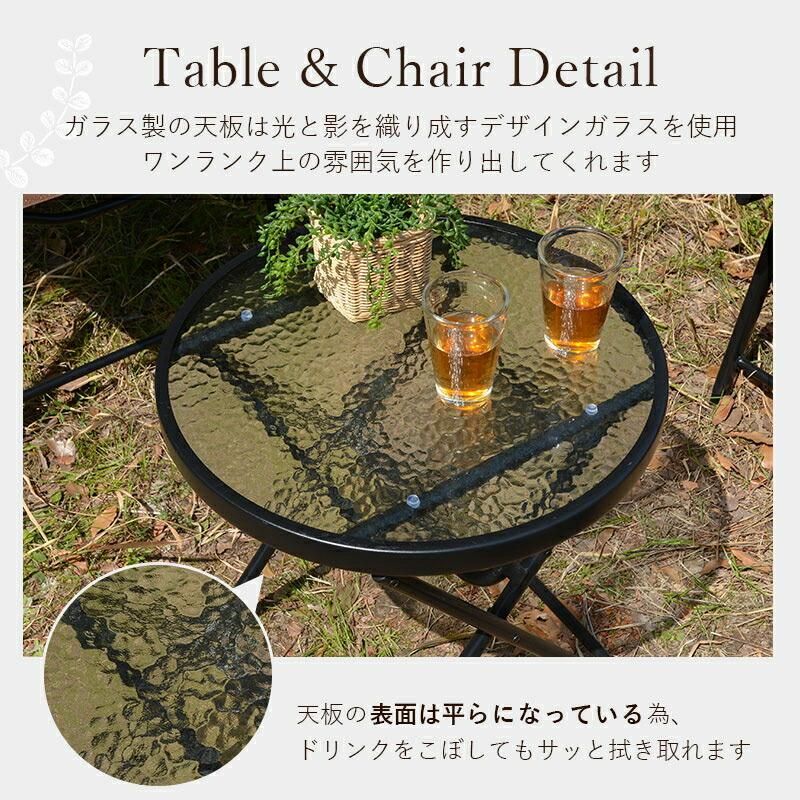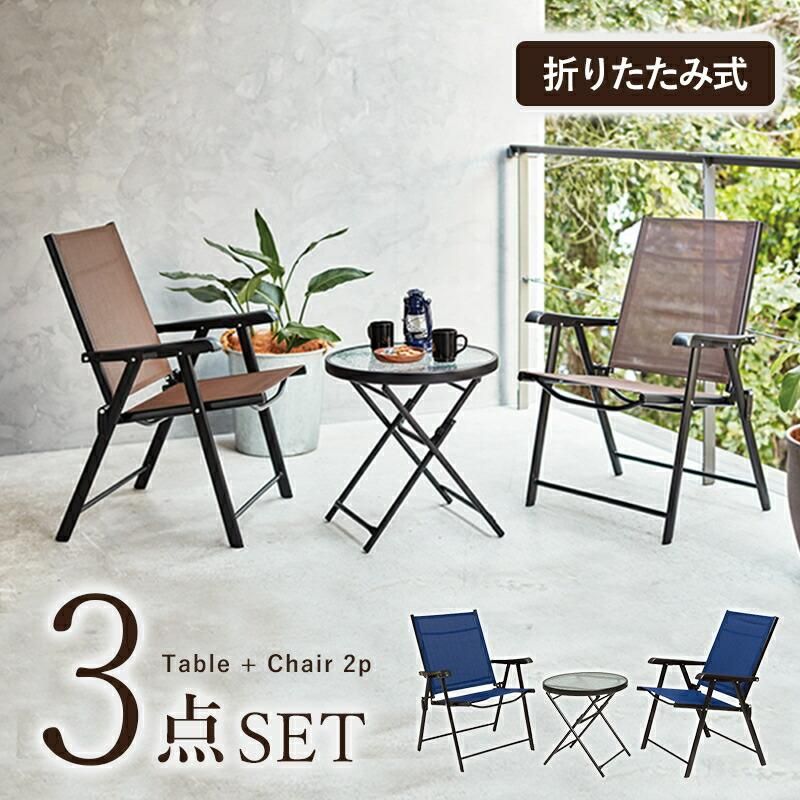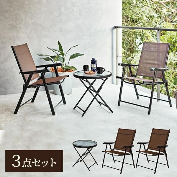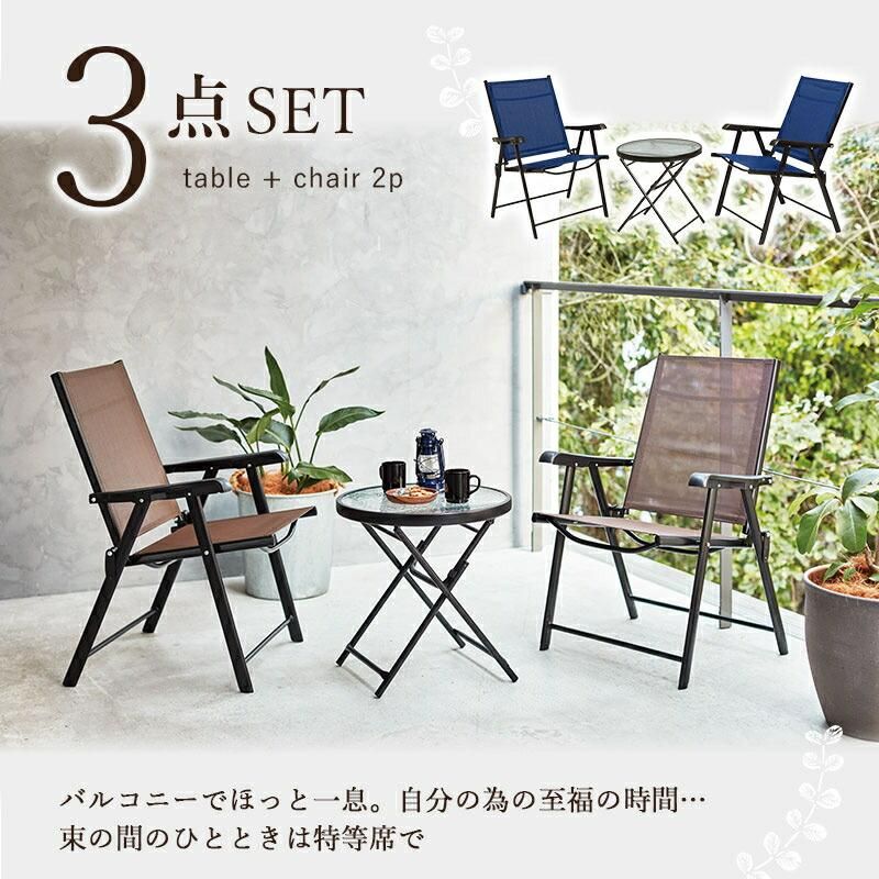 商品説明 ガーデンチェア2点とガーデンテーブルの3点セット。折りたたみ式でシーズンオフの片付けにも困りません