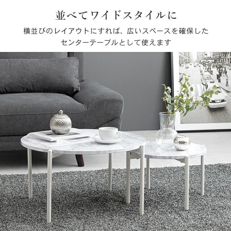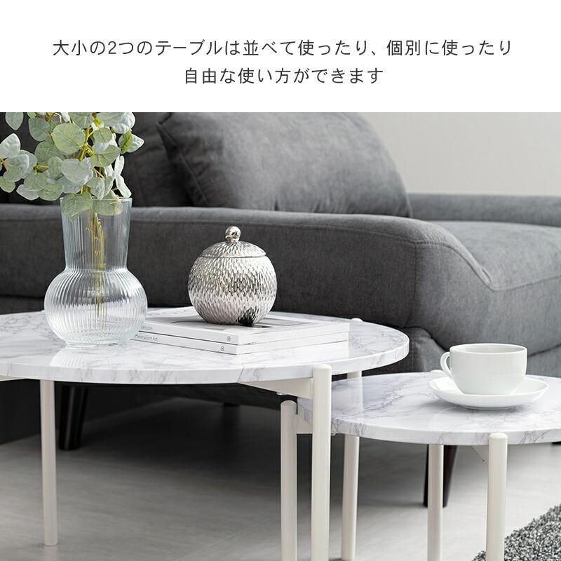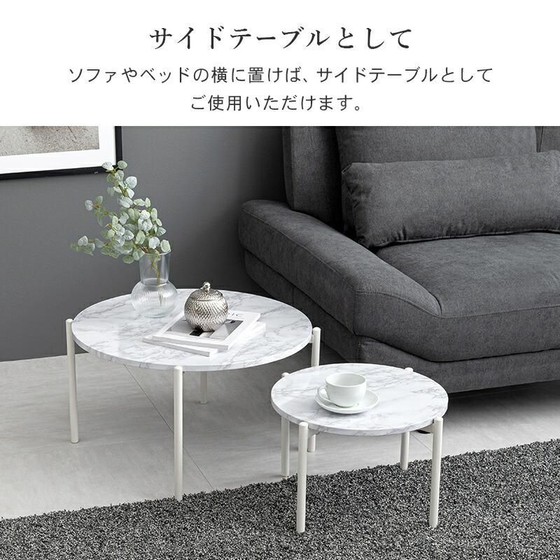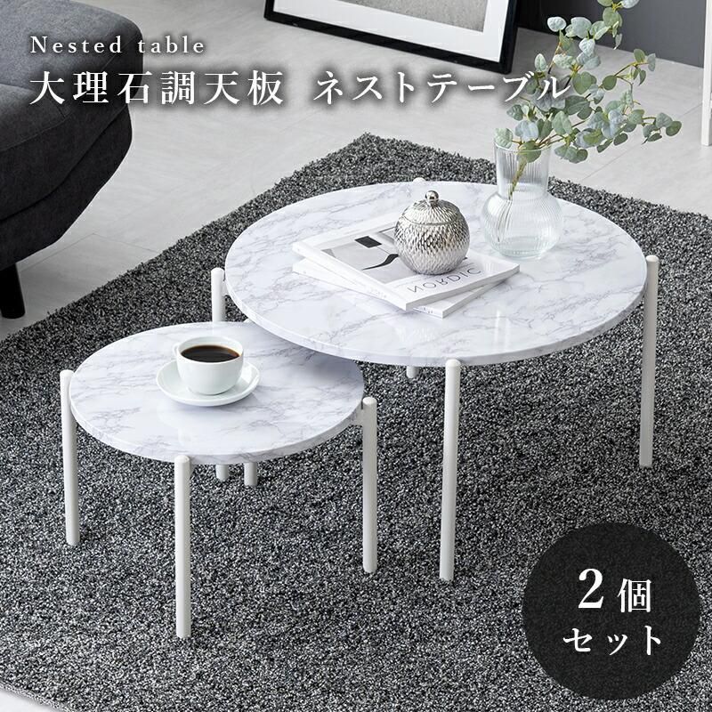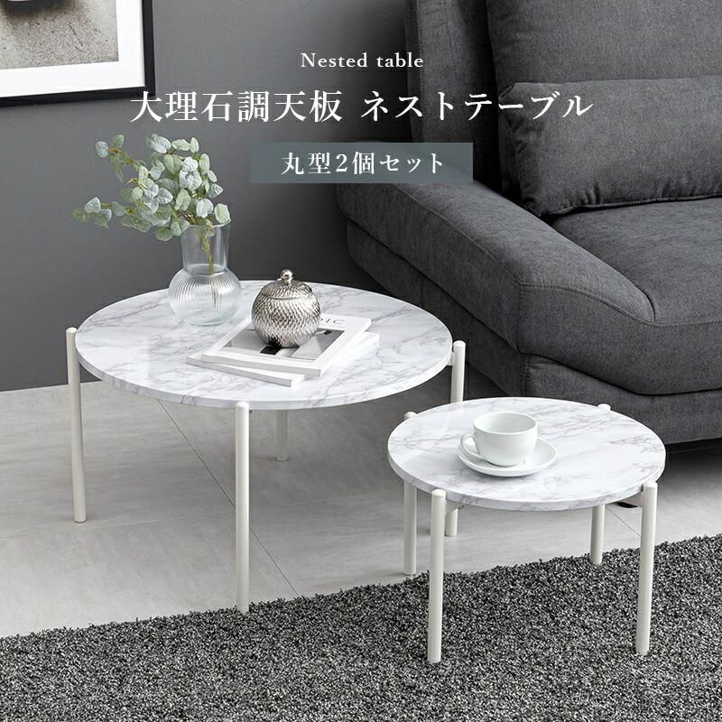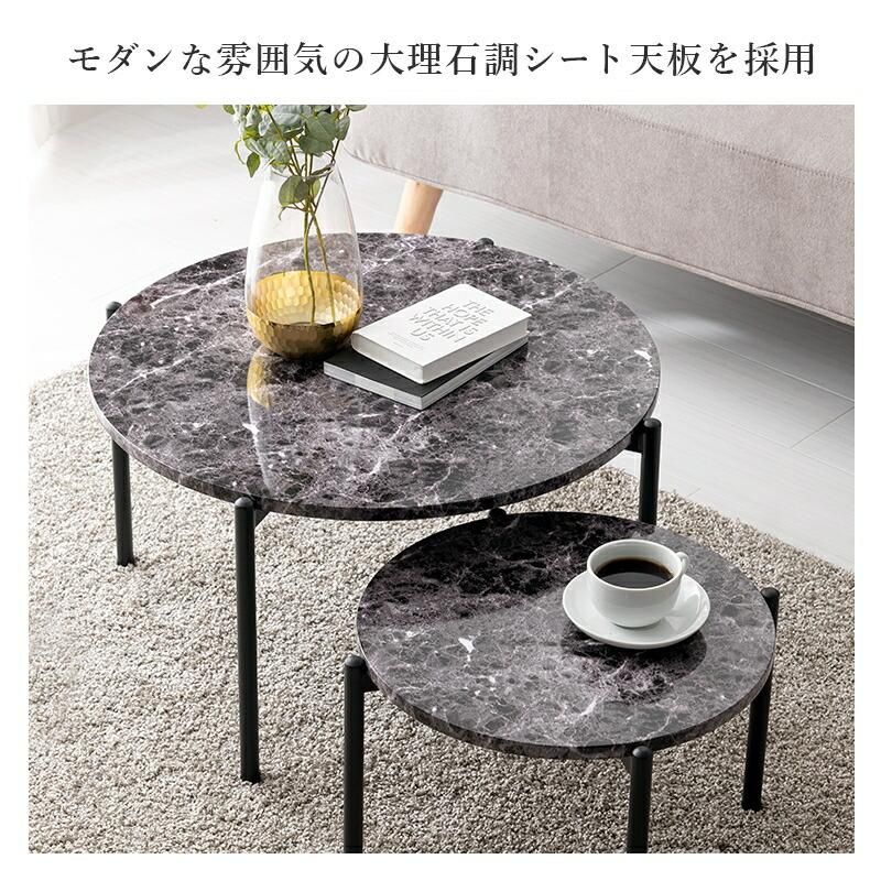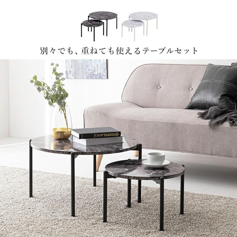 モダンな雰囲気の大理石調天板を使用したテーブルセット。丸型2個セット