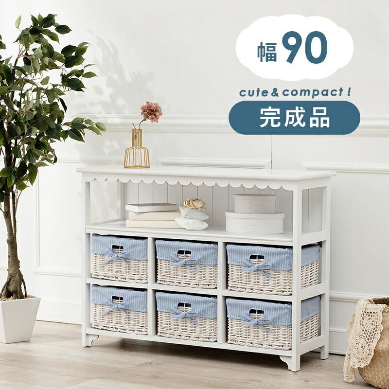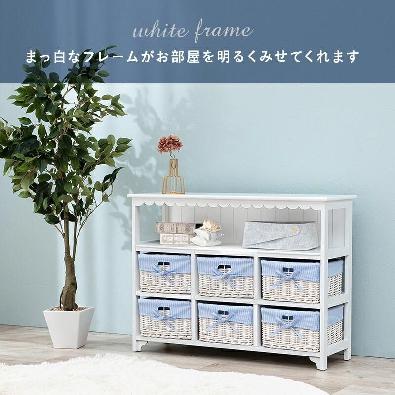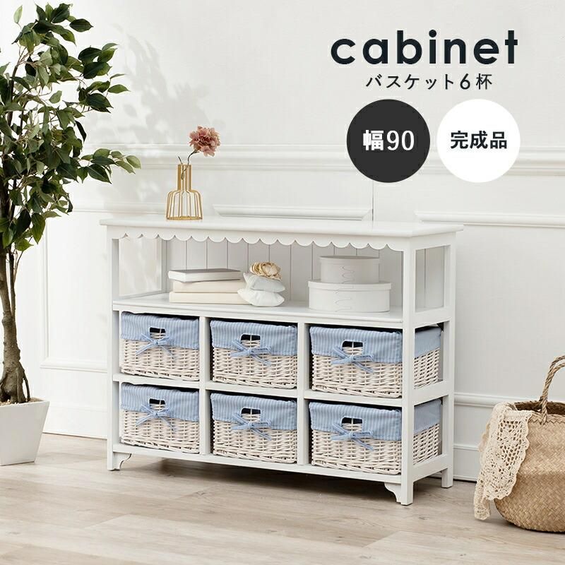 まるでフリルが付いたようなデザインが可愛いデザインのキャビネット。内布付きバスケット6つ付き