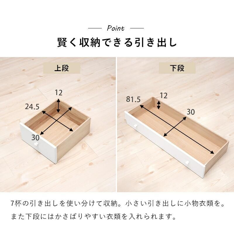 本体サイズ(cm) (約)幅87×奥行37(取っ手2cmを含む)×高さ85cm その他サイズ ■引出内寸(小):(約)幅24.5×奥行30×深さ12cm■引出内寸(大):(約)幅81.5×奥行30×深さ12cm 商品重量(kg) 主材:桐材 組み立て 完成品(脚や取っ手など一部取付が必要な場合があります)