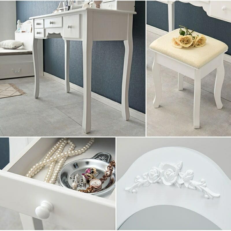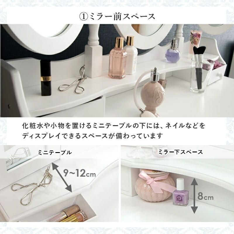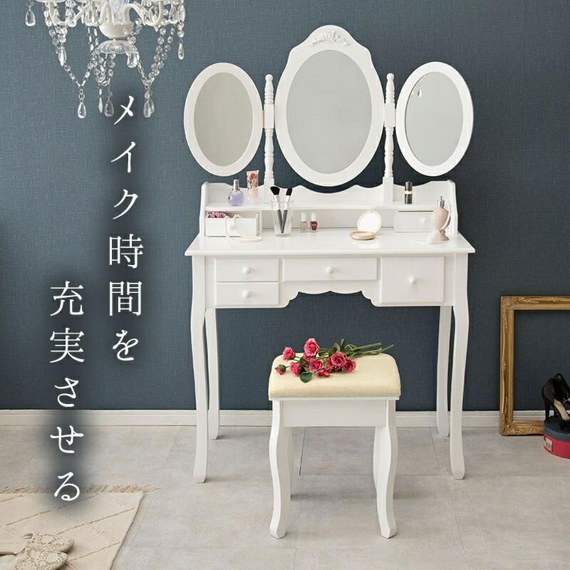 商品説明 楕円形の三面鏡と脚の曲線が上品なドレッサーセット。スツール付き