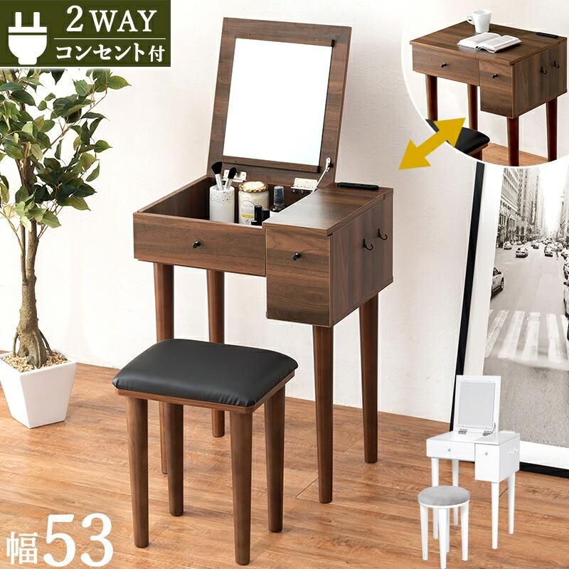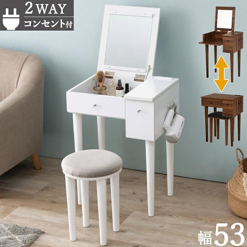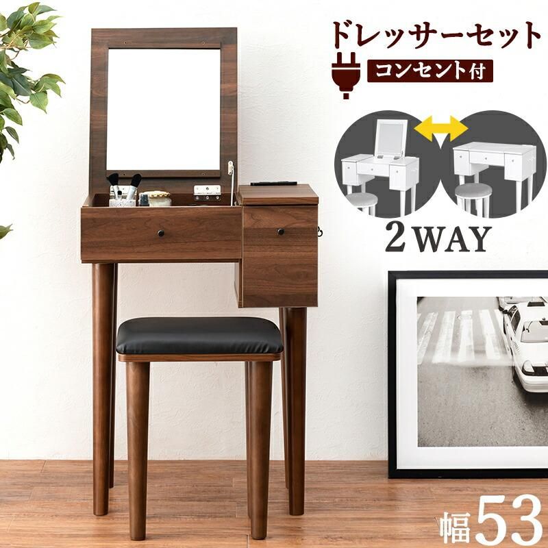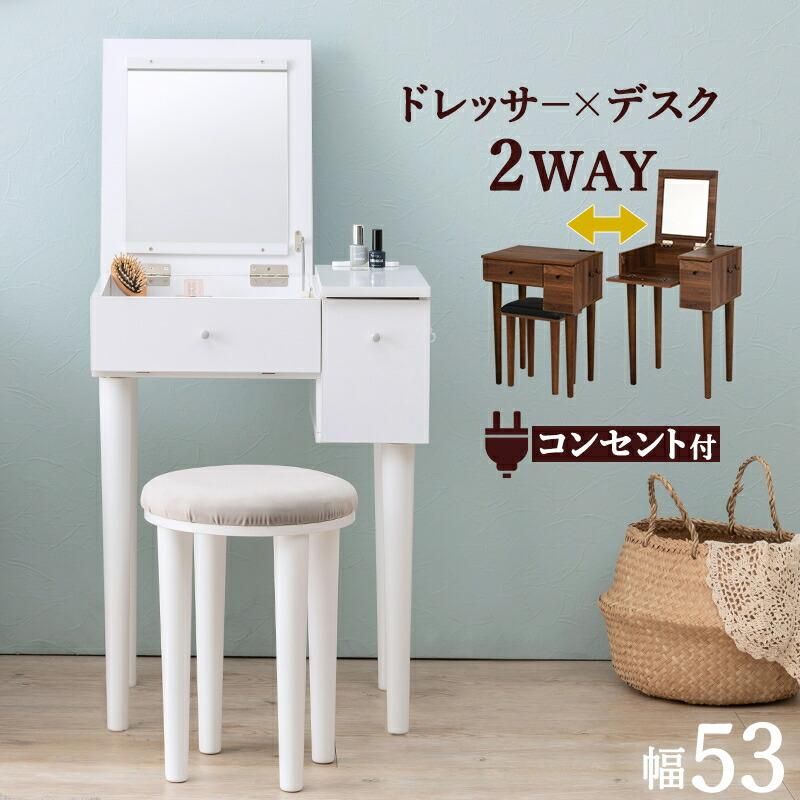 商品説明 ミラーを閉じるとデスクとして使用可能なドレッサー。ミラーの角度調節ができるので顔が見やすい設計です。