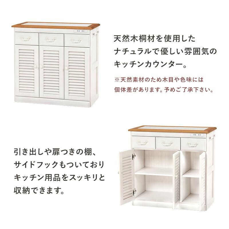 ■キッチンカウンター ホワイトウォッシュ キャスター付 キッチンラック ルーバー扉 コンセント付き 機能性 ツートンカラー オシャレ ナチュラル 北欧テイスト 可愛い カワイイ 2口コンセント キャスター■