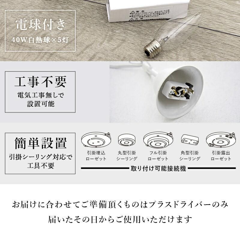 本体サイズ(cm) (約)幅51.5×奥行51.5×高さ59cm (ソケット部+チェーン長さ:43cm) その他サイズ ■シャンデリア球(E17/40W)×5個付 商品重量(kg) 主材:スチール、ガラス 組み立て お客様ご自身で要組み立て