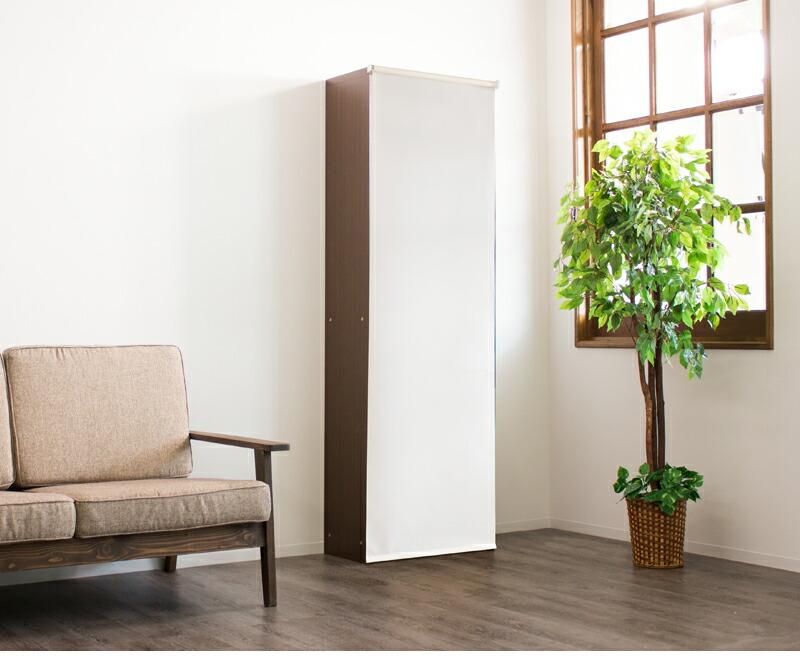 床から天井までの大容量突っ張り本棚にも取付できる専用金具付きロールスクリーンです。高さ250cmを覆い隠せるスクリーンは、簡単に目隠しを行い、室内をすっきり見せてくれます。ラックの天板上に専用アングルで取り付けるだけ。簡単に本格的な目隠しを配置できます。本棚以外にも「洗濯機置き場」や「 キッチンパントリー」などなど、アイデア次第で使用方法は無限大。「オープン下駄箱」の目隠しにも、扉施工よりコストが安く、通気性に優れており最適です。