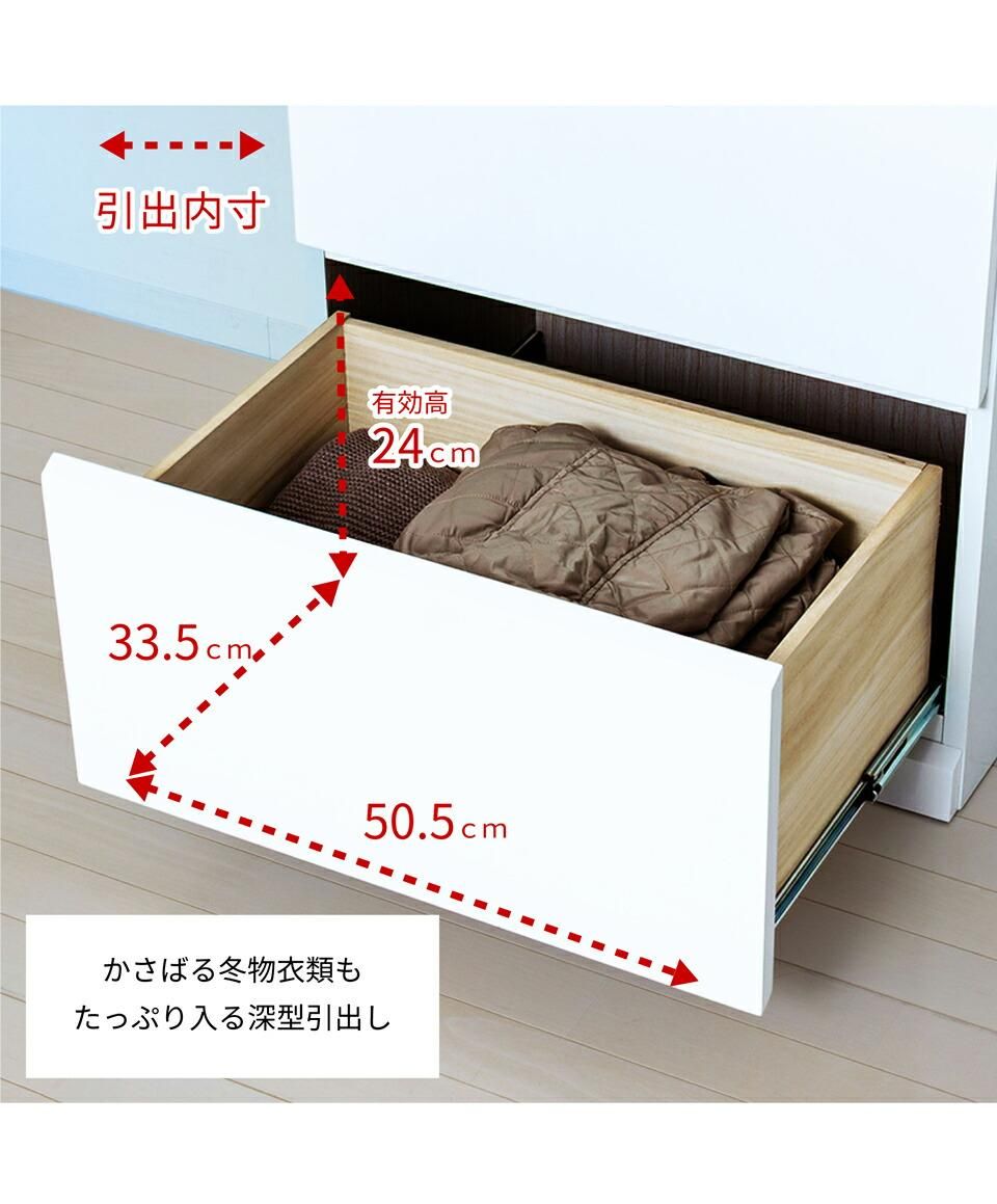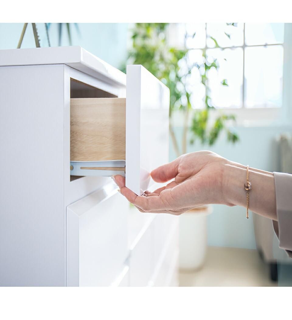 前板と天板は光沢のある鏡面仕上げ。深型の引出しは、セーターなどかさばる冬物衣料も収納出来ます。